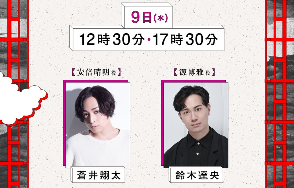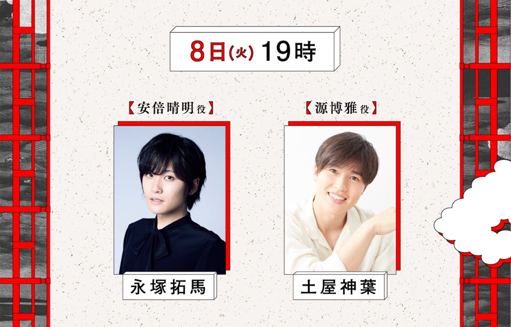 また本作は日替わりキャストで上演する。10月8日(火)は、安倍晴明役を永塚拓馬、源博雅役を土屋神葉が、10月9日(水)は、安倍晴明役を蒼井翔太、源博雅役を鈴木達央がそれぞれ演じることが決定!