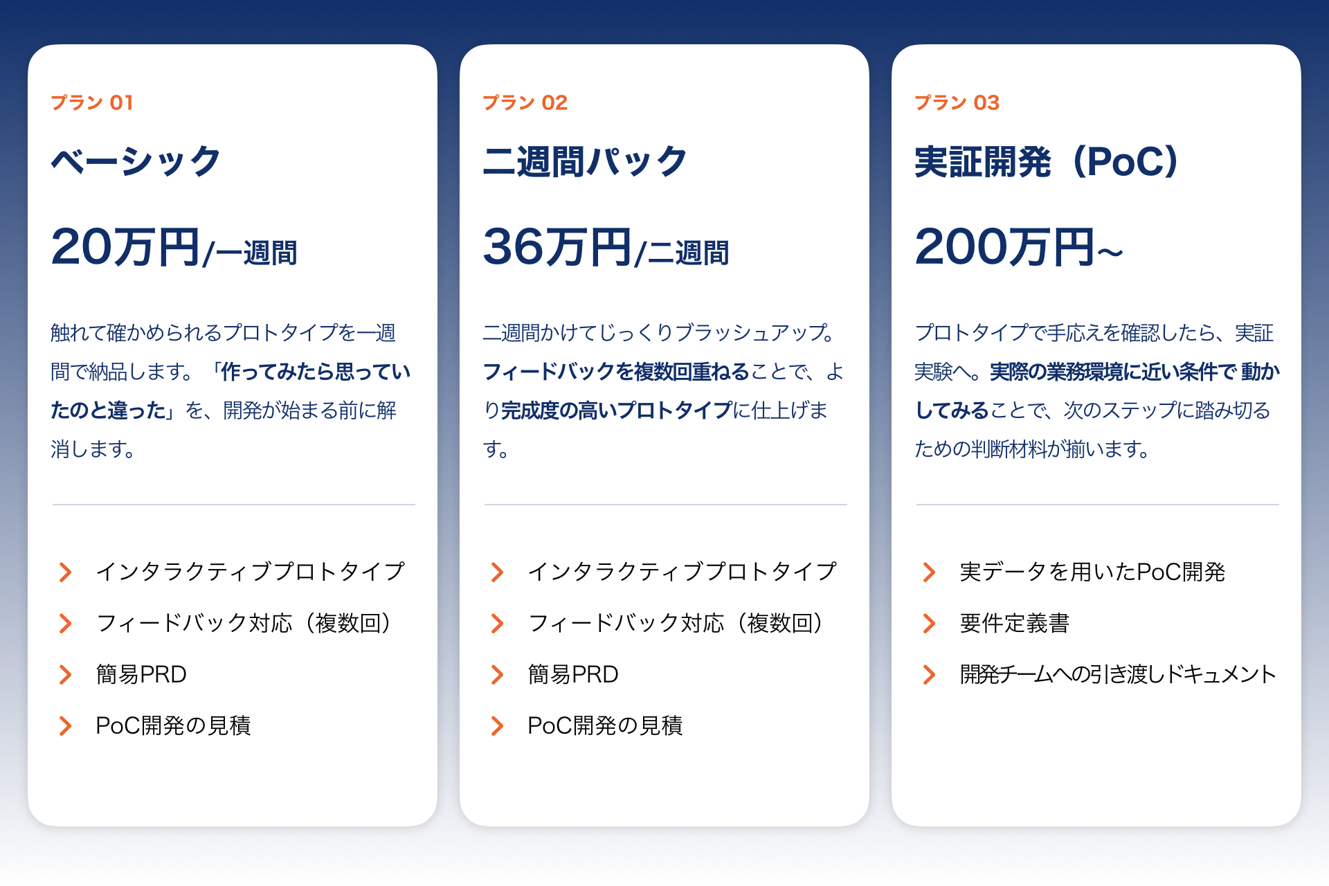 本サービスは、従来、数か月・数百万円規模で行われていたPoCやプロトタイピングを、短期間・低コストで実現。プロダクト開発における検証コストと意思決定スピードの課題を同時に解決します。