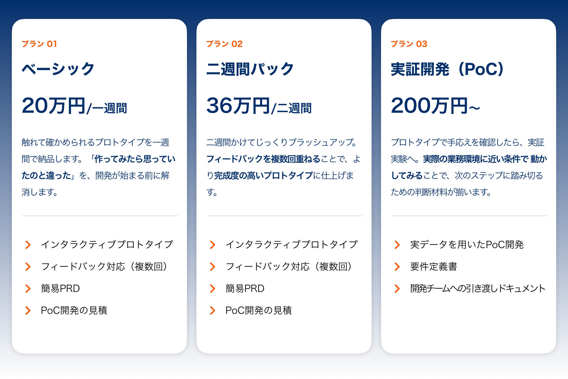 初期構想段階のアイデアや要件を、1週間で「触れて確かめられるプロトタイプ」として納品するサービスです。