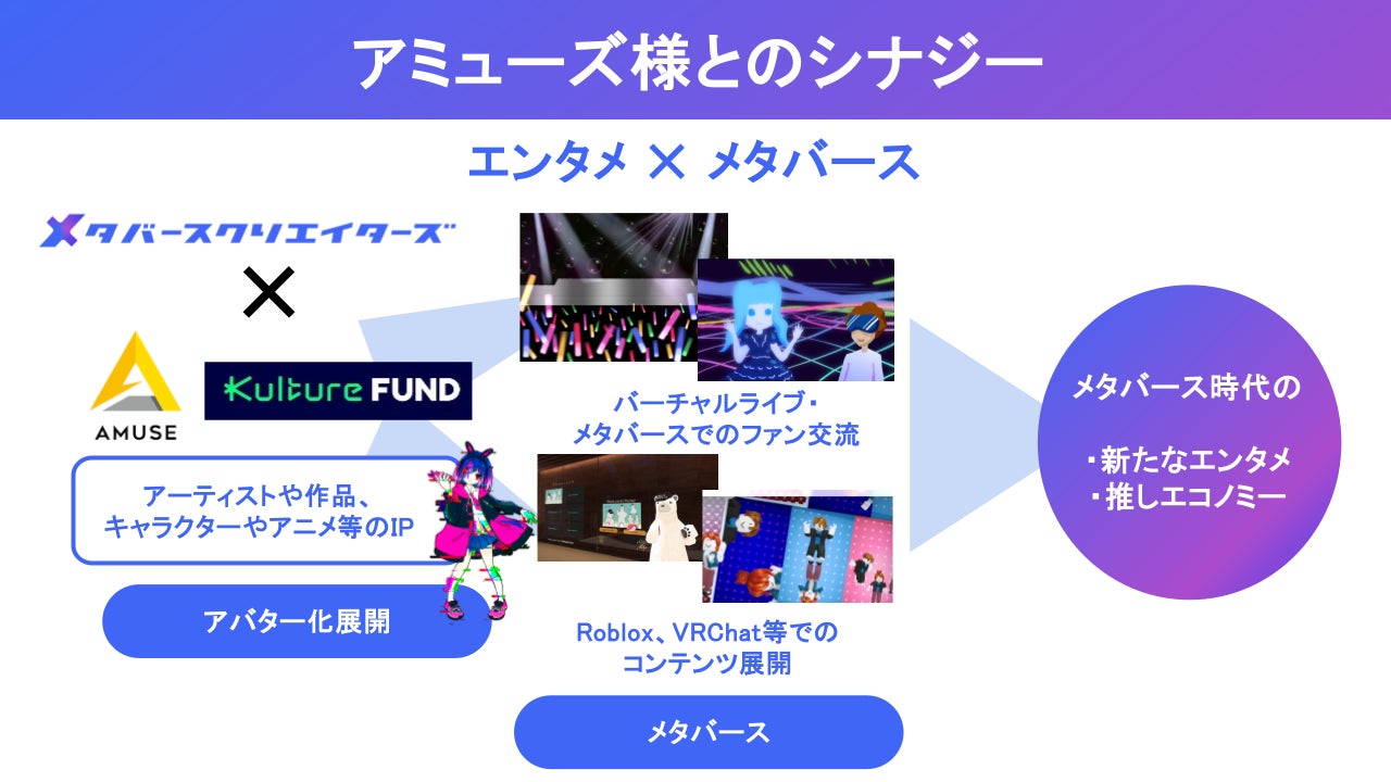①Kulture Fund:アミューズが持つ様々なIPを含むエンタメ領域の事業連携により「エンタメ × メタバース」を強化