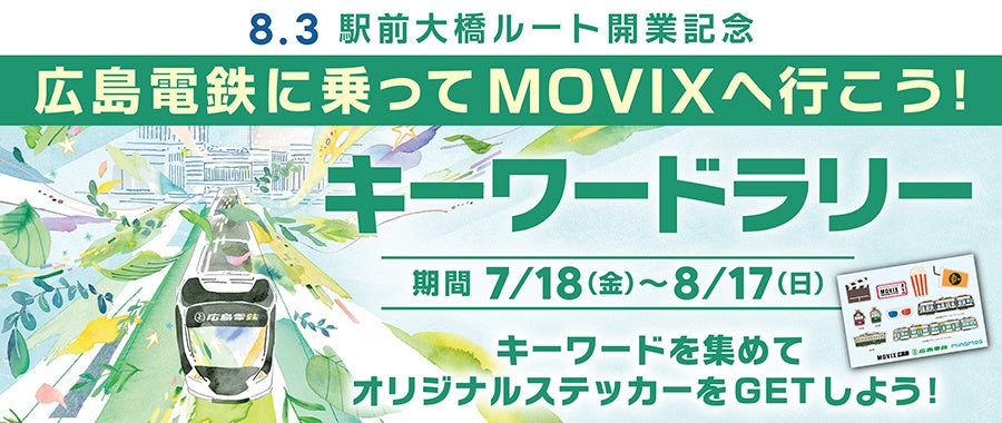 株式会社松竹マルチプレックスシアターズ(東京都中央区、代表取締役社長:樫村暢彦)が広島駅ビル・ミナモア7階にて運営する映画館MOVIX広島駅(広島県広島市)は、8月3日(日)の広島電鉄の新線「駅前大橋ルート」の開業を記念し、広島電鉄(株)、中国SC開発㈱の協力の下「広島電鉄に乗ってMOVIXへ行こう!キーワードラリー」を2025年7月18日(金)から8月17日(日)まで実施致します。