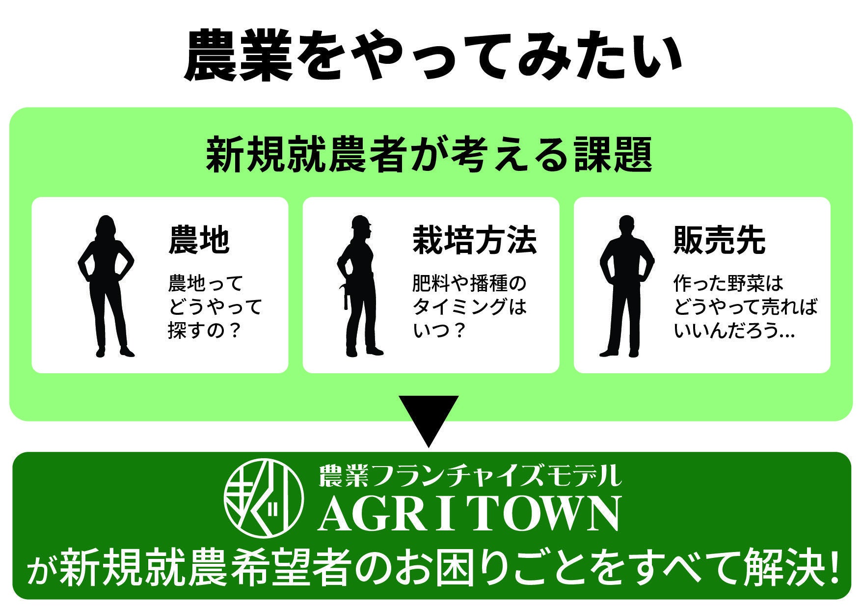 アグリタウンとは、農業への新規参入の課題を解決する農業フランチャイズモデルです。