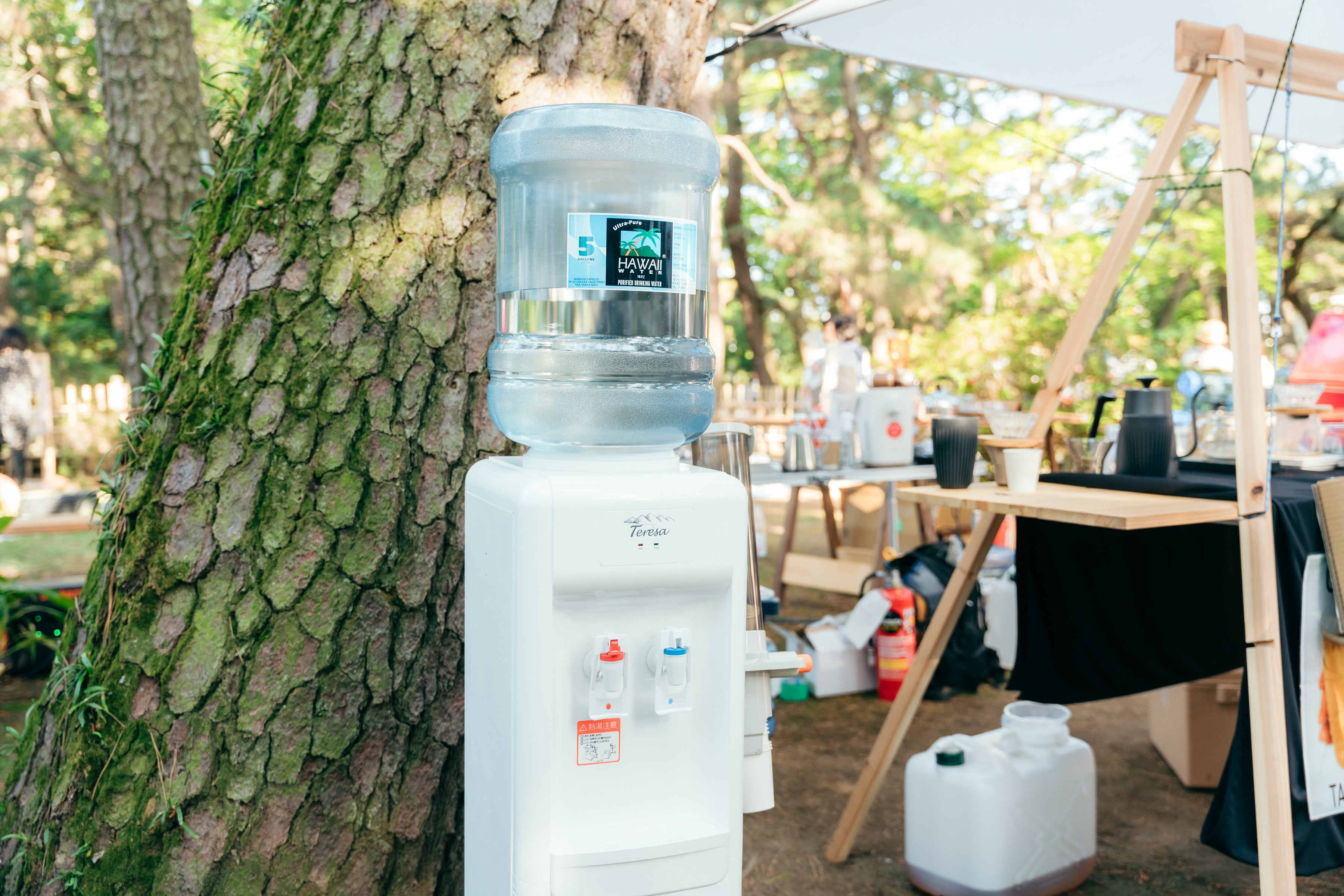 この日のコンテンツのメインである、10店舗以上のコーヒーショップ。高砂緑地では、「CRUISE TOWN COFFEE ROASTERS(茅ヶ崎)」「27COFFEE ROASTERS(茅ヶ崎)」「LITTLE TURN COFFEE(辻堂)」「ungim coffee roasters(辻堂・EC販売のみ)」「HOOP COFFEE(鵠沼)」「i4i coffee(平塚)」「YETI ROASTERY. COFFEE(等々力)」「STORY BOX & coffee roaster(大和)」「Dark Arts Coffee Japan(葉山)」「Pessoa Coffee Roasters(石川県金沢)」が出店しました。今年は試飲ではなく、コーヒーの販売に挑戦。コーヒーを1杯のみならず、いろんな味を楽しんでいただけるよう販売した飲み比べチケットは、事前チケットの完売に始まり、当日チケットはイベント開始1時間で売り切れと、想定よりも多くの方がイベントに興味を持って来て下さり、松林の木漏れ日あふれる会場は、賑わいと美味しそうなコーヒーの香りに包まれていました。特に今年は「ZEF COFFEE ARTS」に浄水システムを設営して頂き、コーヒーに最適なお水で提供することができました。