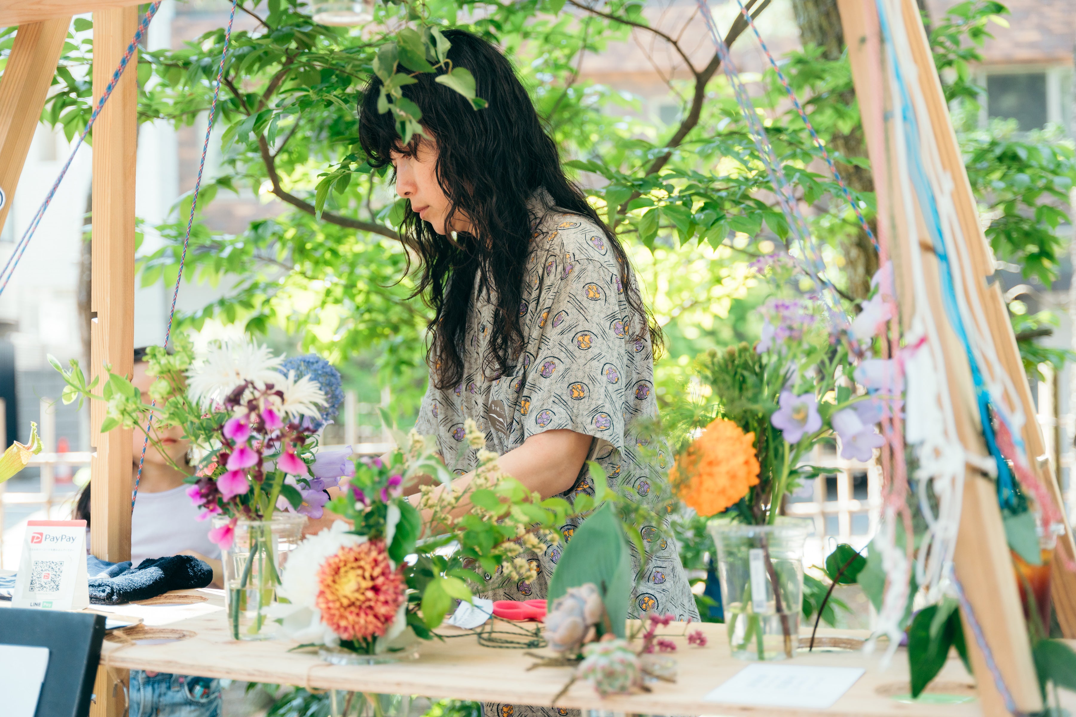 みどりの日ということで、素敵な花や植物もならびました。「umu.」では、コーヒーを飲み歩くように、花とすごすためのcup bouquetが販売され、cup bouquet用にカスタムされたオリジナル屋台、”waosk”も登場しました。「KiHEN」は生地や資材に無駄がないようオーダー製作をしているお洋服、「cap nuts」では、くるみボタンを使ったアクセサリーを販売しました。
