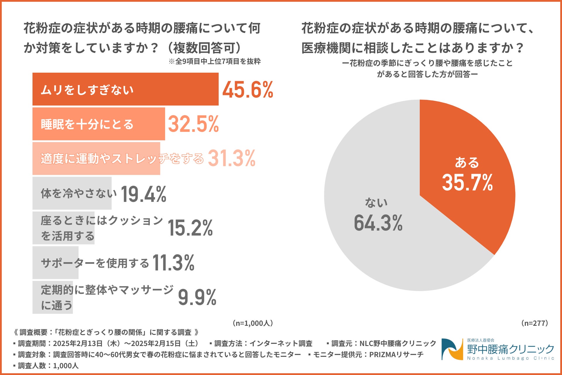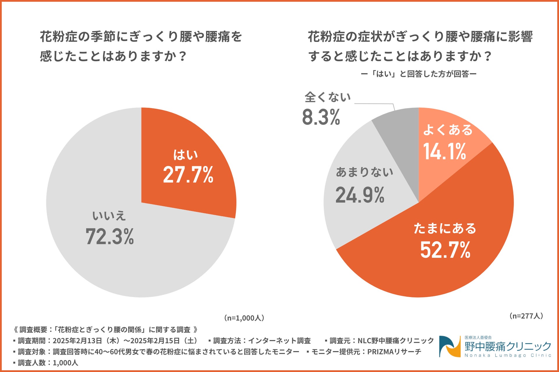 そこで今回、野中腰痛クリニック(https://nonaka-lc.com/)は、40~60代男女で春の花粉症に悩まされている方を対象に、「花粉症とぎっくり腰の関係」に関する調査を実施しました。