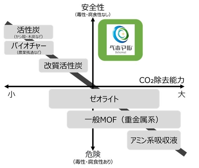 当社材料は、今年京大の北川先生がノーベル化学賞を受賞した案件「MOF:金属有機構造体」の1種であり、バイオMOFと呼ばれる植物由来の多孔質材料です。
