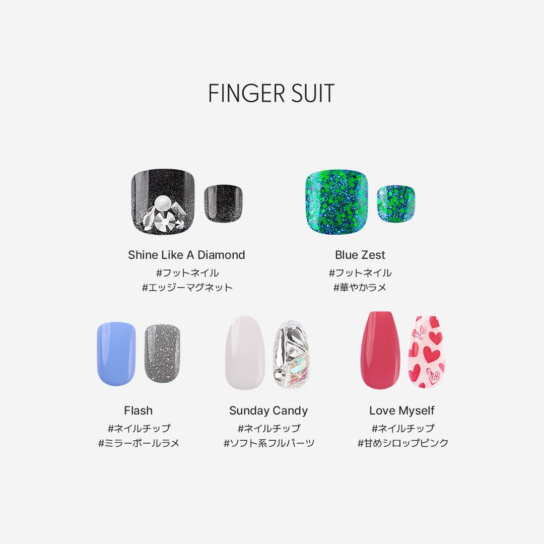 2021年に韓国でローンチされたFINGER SUIT(フィンガースーツ)は、ネイルをファッションの一部としてとらえ、約1分で美しい指先を演出するスタイリッシュなネイルチップをお届けしています。同年日本でもオンライン販売を開始し、ご好評につきまして2023年5月から日本での人気デザインをメインにオフライン店舗における販売も開始しております。また、日本のお客様の暖かいご声援により、2023年8月からは取扱い店舗を約180店舗まで拡大し、ハイクオリティなネイルチップを日本の皆さまにお届けしております。