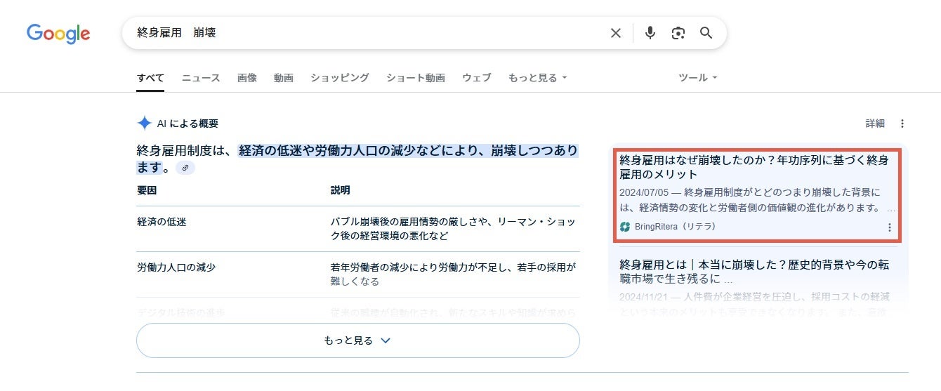 AI Overviews(AIによる概要)は、Google検索結果上部に表示されるAIによる検索に対しての回答です。AIが参照しているウェブページへのリンクと共に示されます。次の例は、BringRitera(リテラ)で出力された記事が参照先に選ばれた状態で表示されたAI Overviewです。