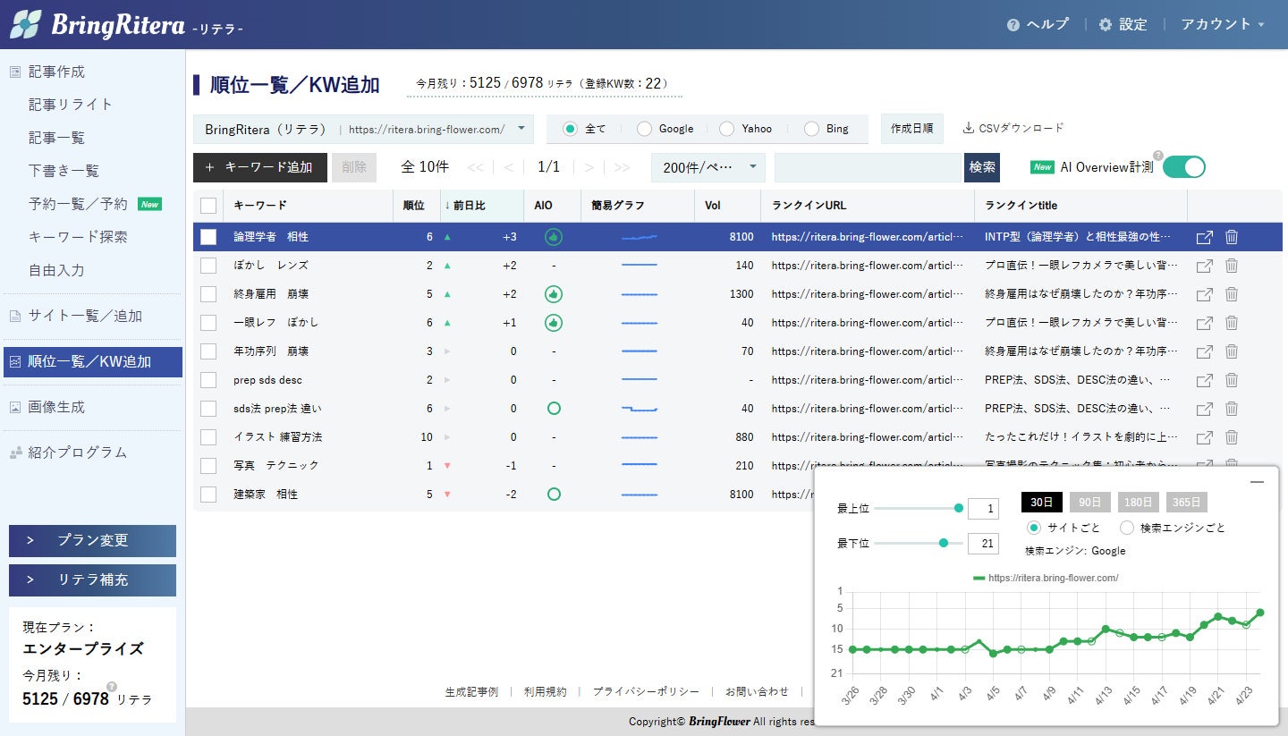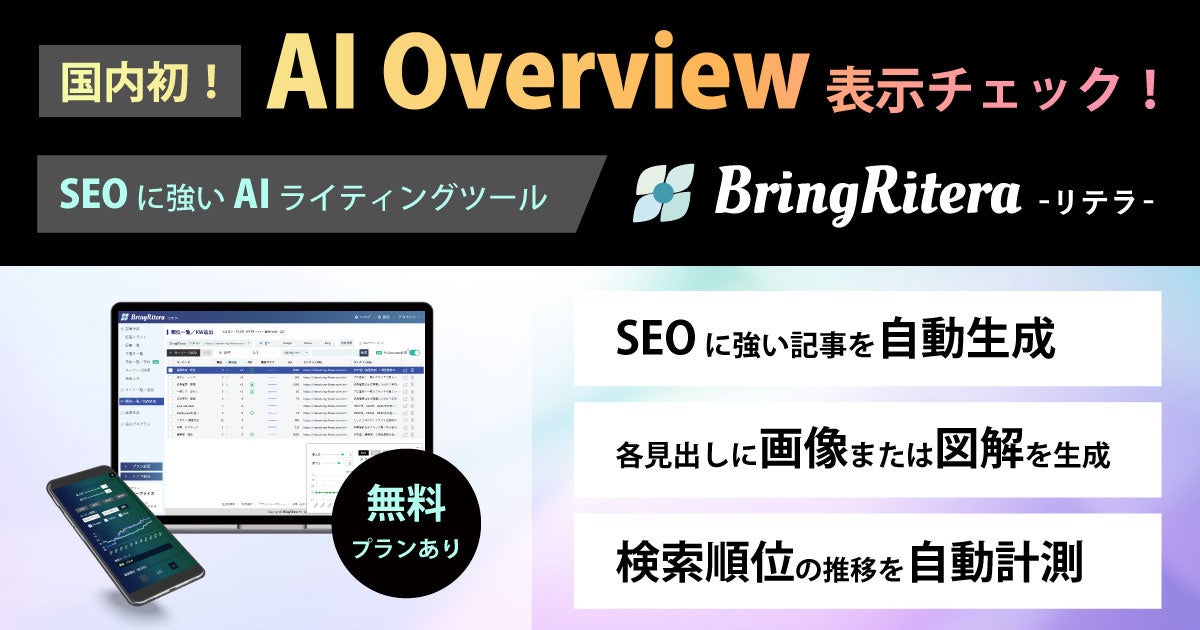 株式会社BringFlower(東京都新宿区、代表取締役:稲田 高洋)は、当社が開発・運営するSEOに強いAIライティングツール「BringRitera(リテラ)」について、「AI Overviews」の表示推移を計測する機能を追加したことをお知らせします。