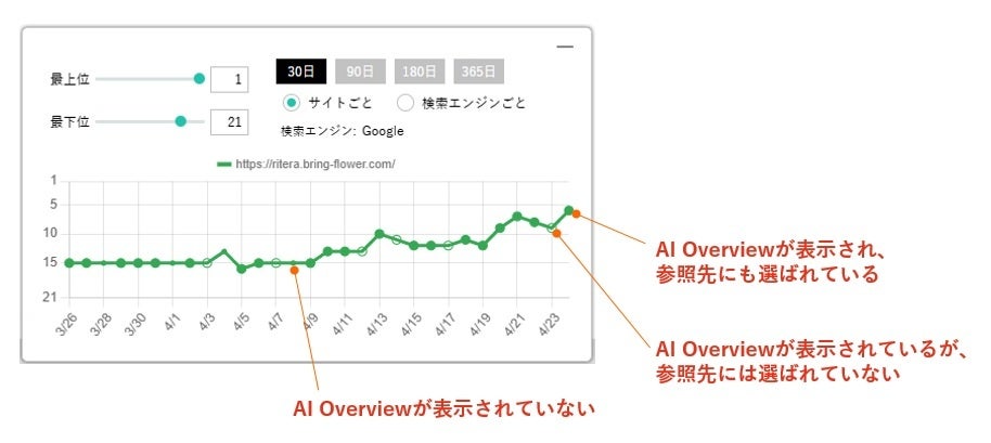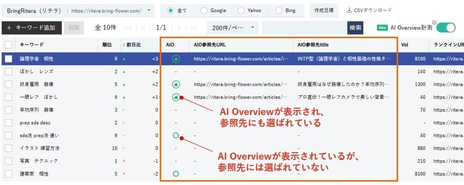 この機能によりBringRitera(リテラ)のユーザーは、どのようなキーワードの場合にAI Overviewsが表示され、どのような内容が参照先に選ばれやすいかの分析を行うことができます。