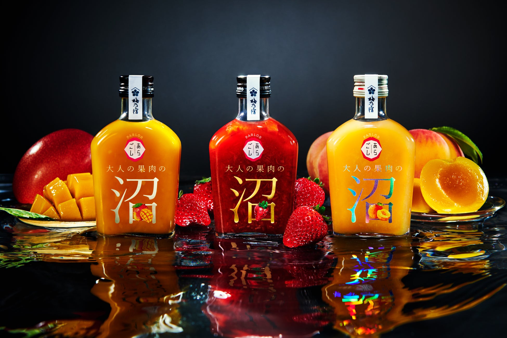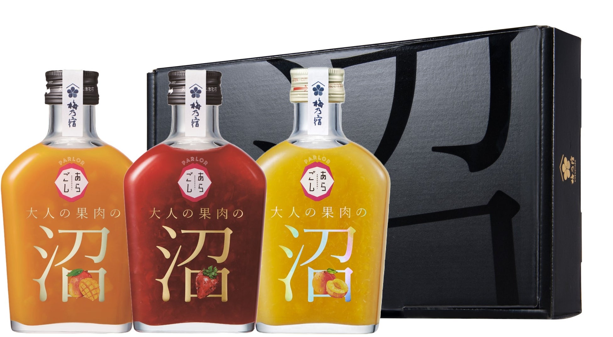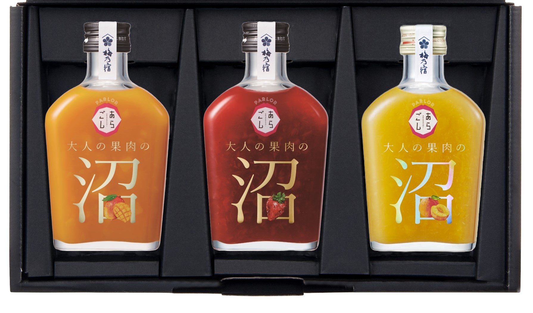 PARLORあらごし大人の果肉の沼「もも」の発売を機に、シリーズ全3種(「いちご」、「マンゴー」、「もも」)各1本ずつの、「 PARLORあらごし沼まみれ3本セット」を2024年4月23日より梅乃宿酒造公式オンラインショップ限定で販売開始します。