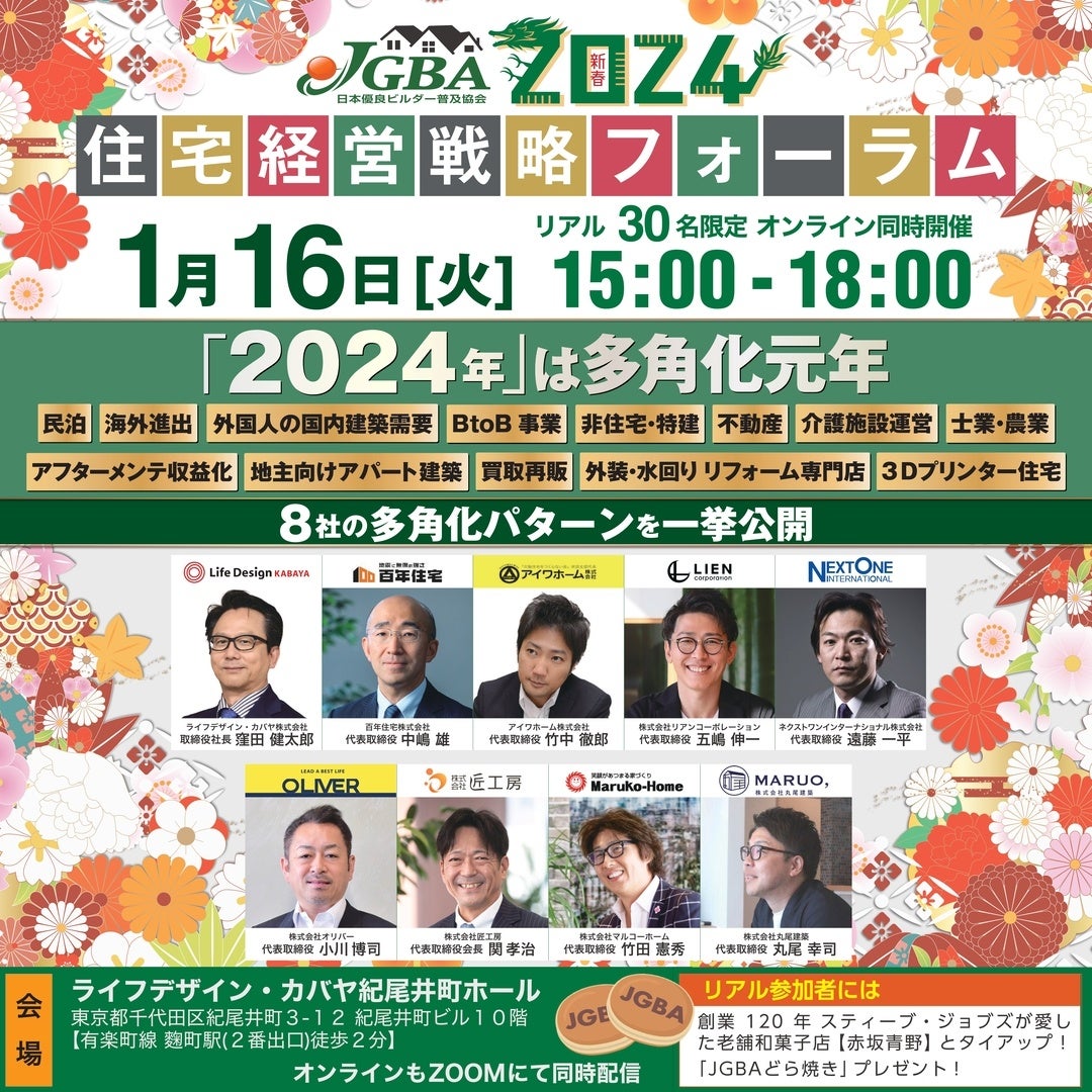 JGBAでは、この度2024年を「多角化元年」と位置づけ、リアル・オンラインの両方で新春フォーラムの開催を決定しました。それぞれの地域のトップビルダー経営者でもある、JGBAの役員8人が一堂に会する4部制で、各社の実例を一挙公開します。〝海外進出〟〝BtoB事業〟〝非住宅・特建〟〝アフターメンテ収益化〟〝買取再販〟などなど、近年、注目度が高まっているキーワードが盛りだくさんとなる見通しです。