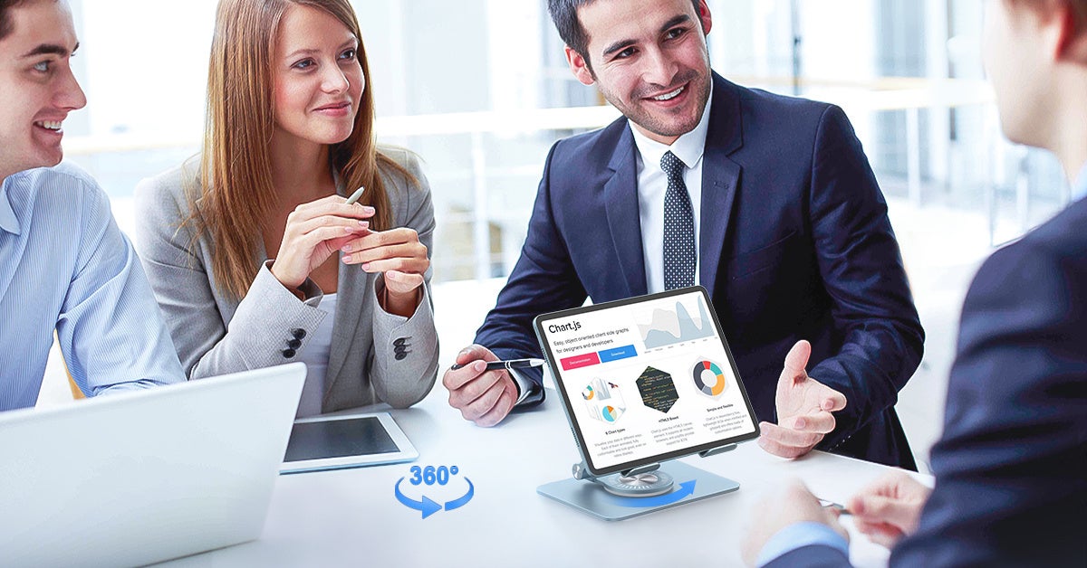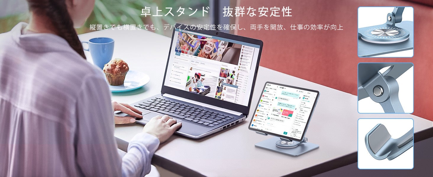 【360度回転&無段階調整可能】このタブレット回転スタンドは360°回転ベースを備えており、お使用状況に応じて、手で軽く押すだけで360度自由に回転することができます。お好みの高さや角度も無段階で調整することができます。お客様と資料を共有する際には、スタンドを動かす必要がなく、回転するだけで相手と簡単に画面を共有することができ、商談、オフィスでの会議、講演、自宅でのリモートワーク、家族と一緒に映画鑑賞などに最適なタブレットスタンドです。