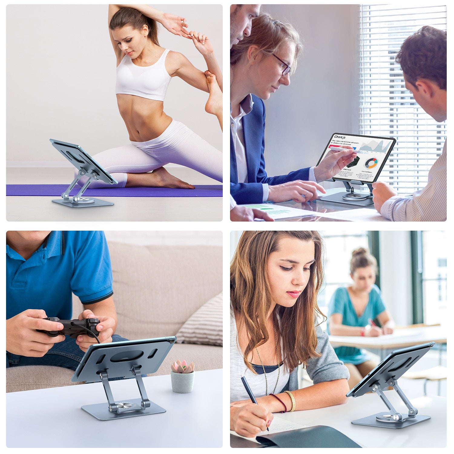 当社のタブレット用スタンドは、タブレットを簡単に高く持ち上げ、傾けて最適な視野角にすることができます。映画を観たり、電子書籍を読んだり、FacetimeやZoomミーティングを利用したり、宿題をしたり、レシピを見たり、ゲームを楽しむ際に快適さを保証します。360°回転ベースを備えた当社のタブレットスタンドホルダーでは、タブレットスタンドの角度を自由に調整して、ご希望に合った最適な視野角を設定することができます。また、コンテンツの共有も非常に簡単になります。
