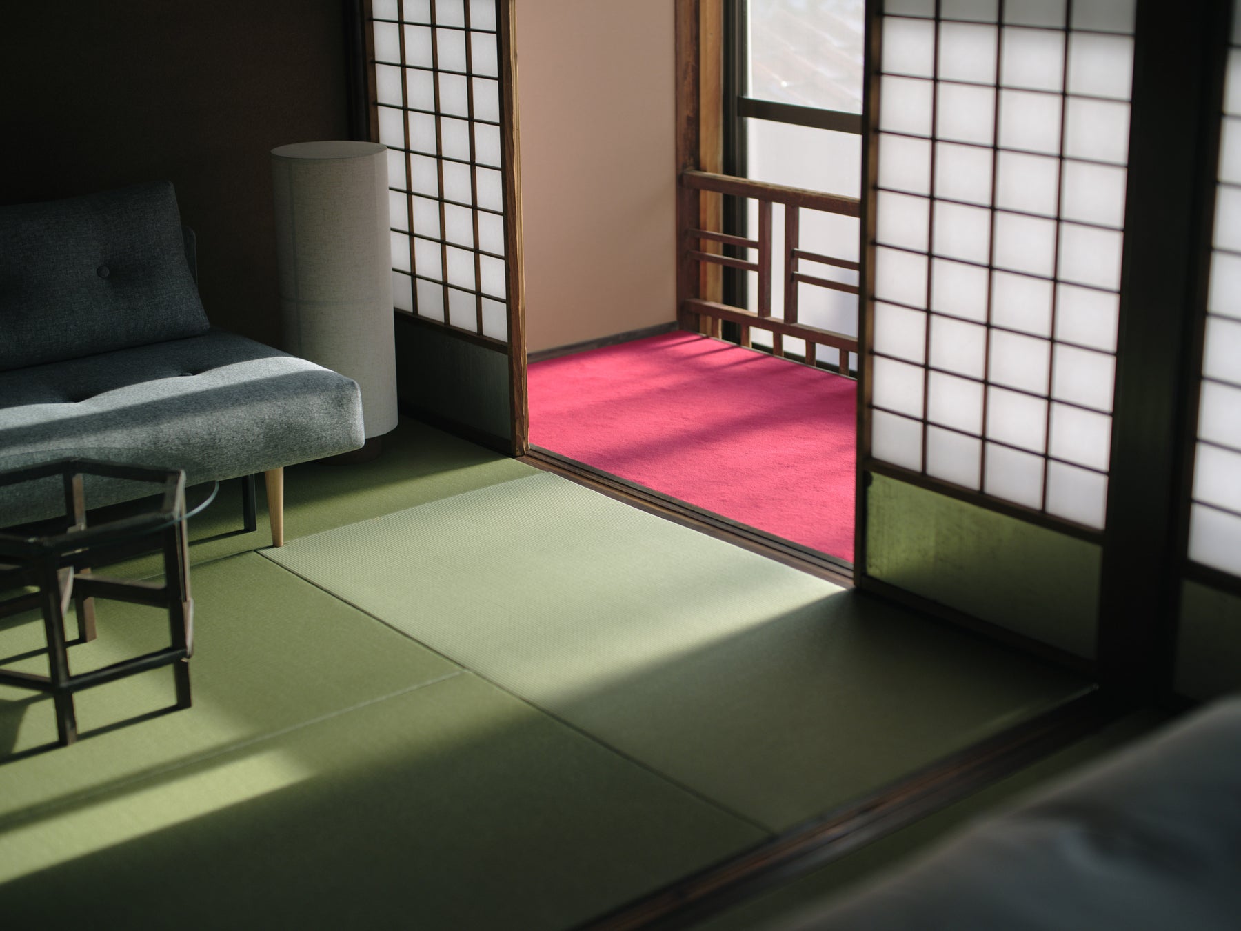 Komado ベンガラは、小松市の中心部で町衆文化が今も息づく龍助町にあります。町家を改修してつくられた3つの客室では、この町の息遣いを感じられます。客室の窓の先に広がるのは、季節の移ろいを感じる中庭や、格子越しの通りの町の気配、瓦屋根の景色など、それぞれ異なる小松の日常風景。受け継がれてきた文化と新たな感性が静かに交わる空間で、ゆったりとした時間を過ごすことができます。