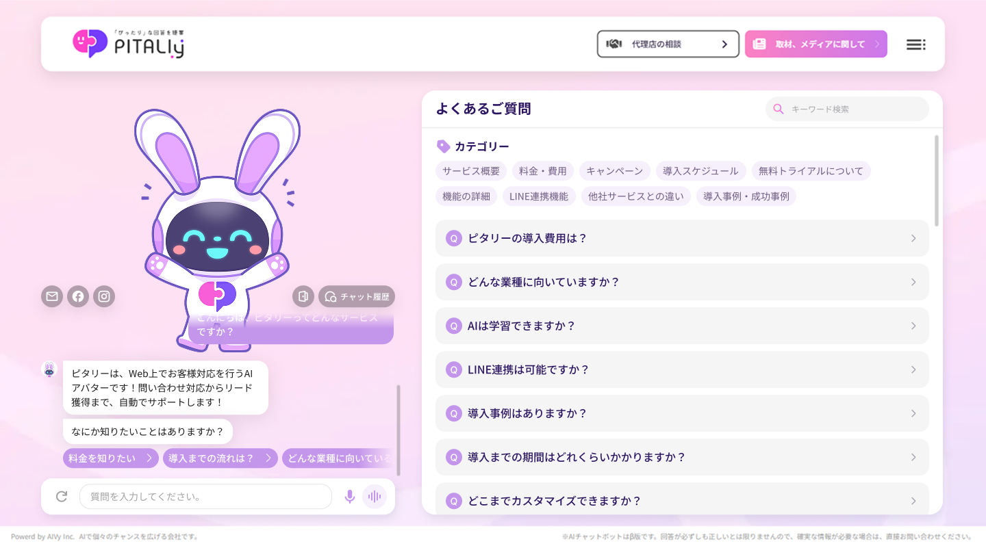 ピタリーは、問合せ対応とリード獲得を同時に行う、AIアバターサービスです。