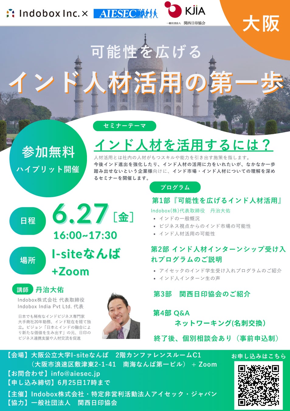 日本企業のインド進出サポート・インド人材の日本展開を行うIndobox株式会社(本社:愛知県名古屋市、以下Indobox)と、日本企業へ海外学生インターンシップ受入れ支援を行う特定非営利活動法人アイセック・ジャパン(以下アイセック・ジャパン)は「日印研修生交換事業」で連携し、2月の東京に続いて、名古屋と大阪で共同セミナーを開催致します。次世代のグローバルリーダー育成と日本企業のインド理解・インド人材活用を促進します。