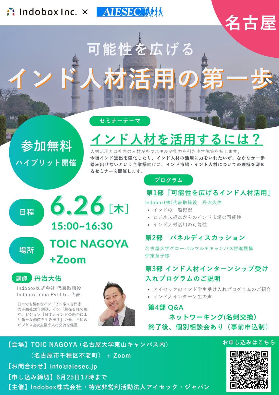 【インド人材活用セミナー 6/26名古屋・6/27大阪】NPO法人アイセック・ジャパンと共催「可能性を広げるインド人材活用の第一歩」