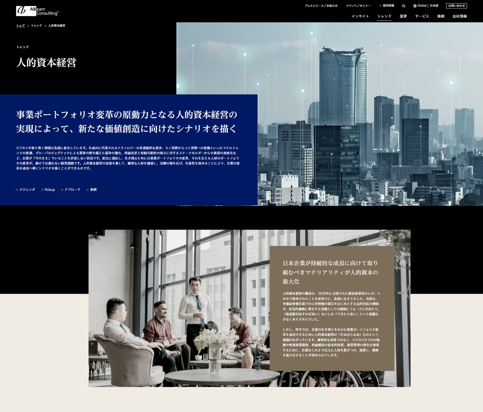 シンプルでわかりやすいグローバルナビゲーションを設定し、「いま知りたい情報」をスピーディーに見つけることができる利便性の高いサイト構成に一新しました。トレンド・業界・サービスの各カテゴリーページでは、関連する最新トピックスが掲載され、アビームコンサルティングならではの知見や具体的な支援実績などを提示します。