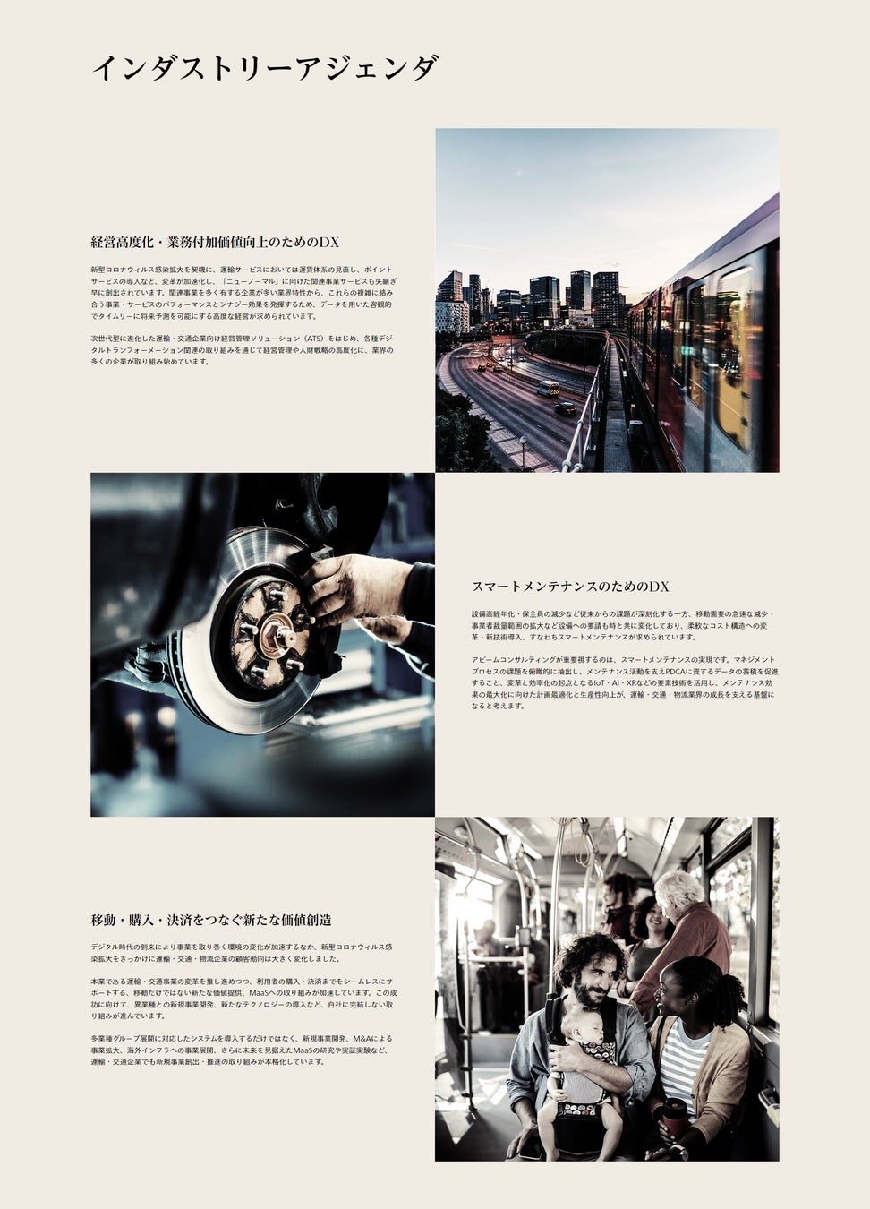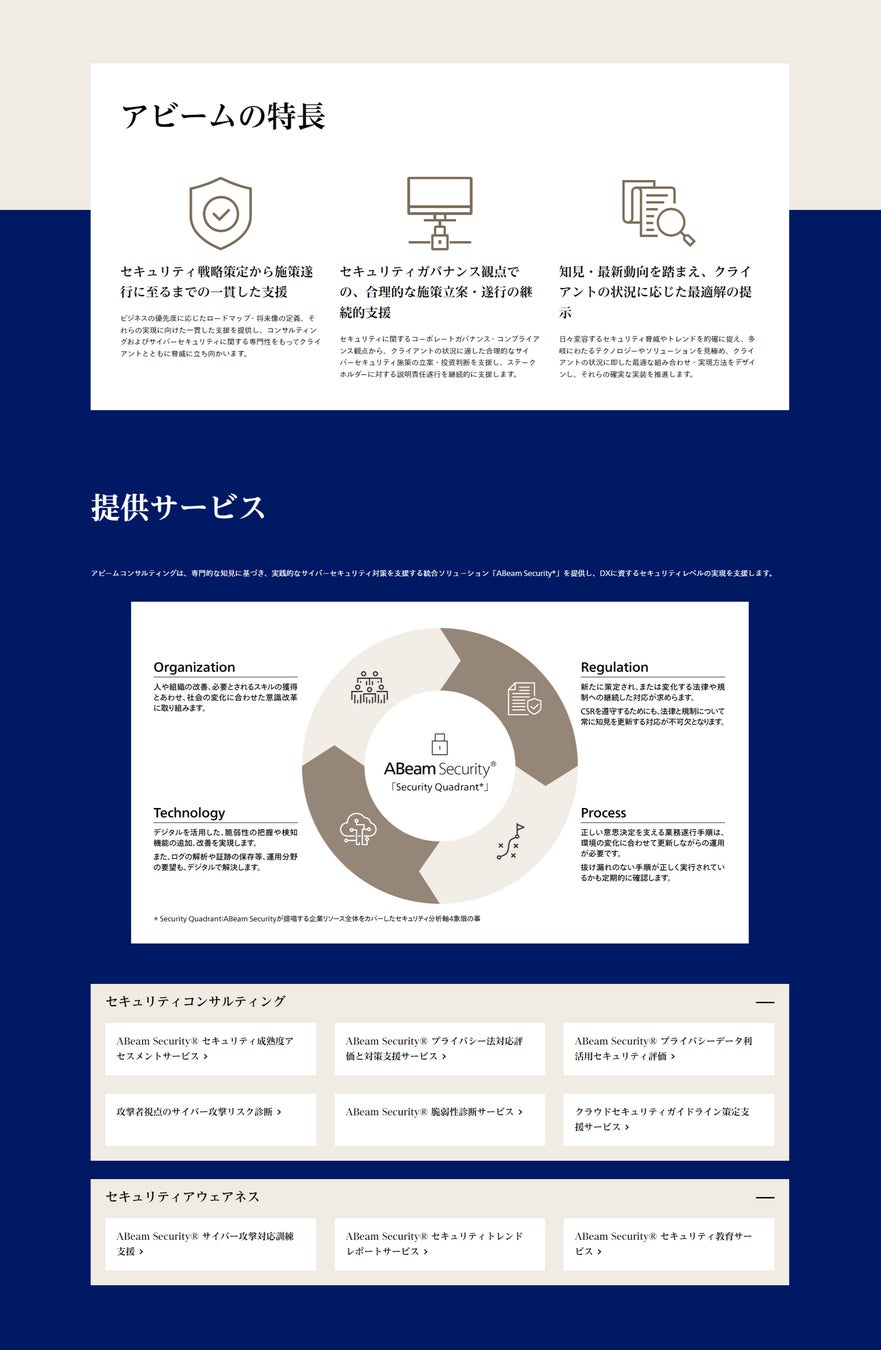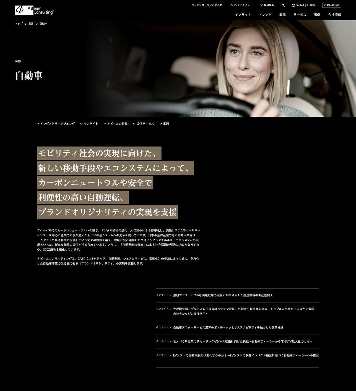 業界・サービスの各カテゴリーページでは、企業や組織が向き合う社会変化やトレンドを踏まえて、変革のアジェンダやマテリアリティを提言するとともに、アビームコンサルティングの課題解決に向けたアプローチについて紹介しています。また、新たに「アビームの特長」を設け、どのような強みやケイパビリティを活かして、その変革や課題解決に伴走するのかを訴求するコンテンツを設置しました。