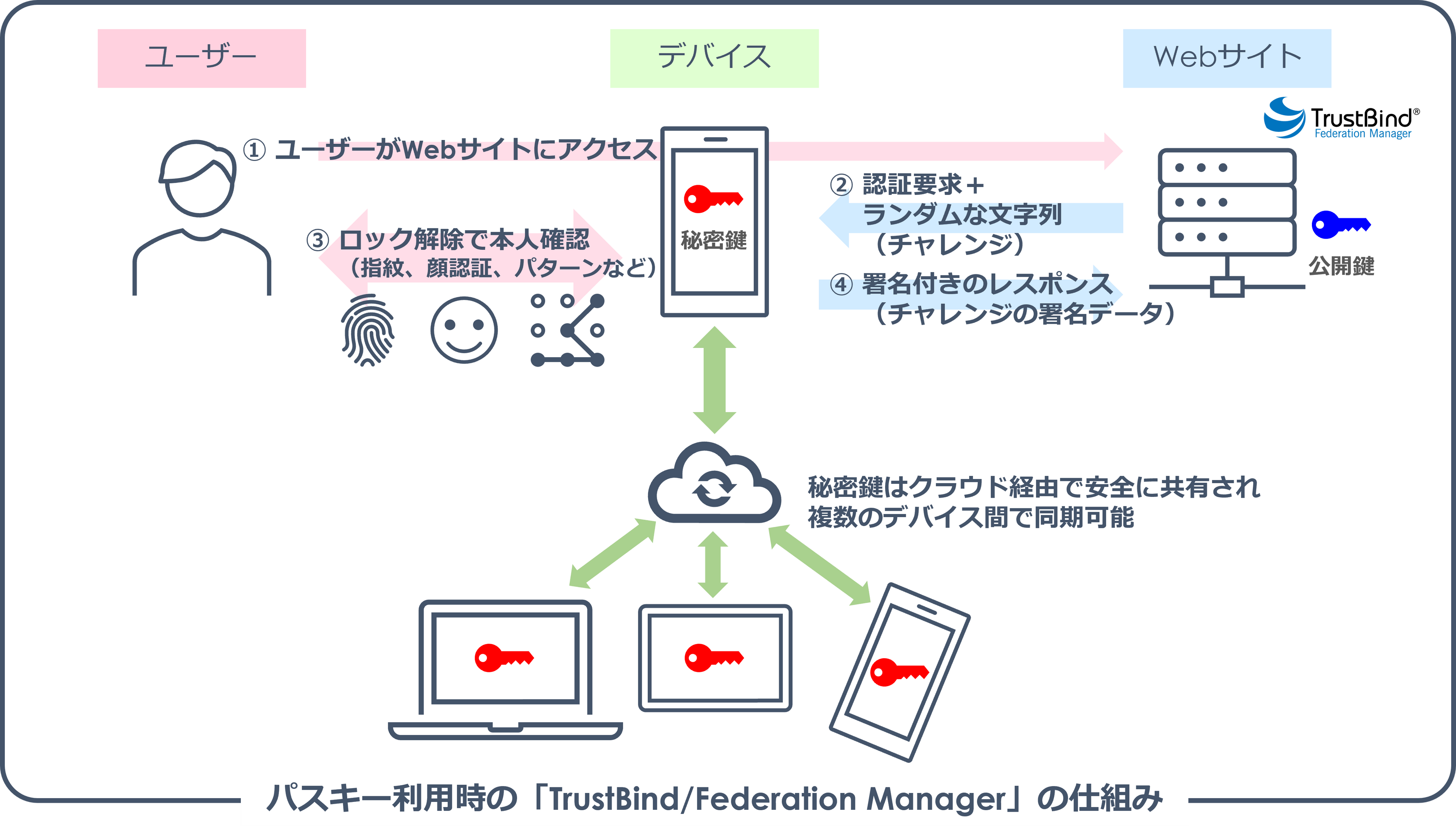 パスキー認証は、パスワードに代わる新たな認証方式として注目されており、フィッシング耐性やUI/UXの向上など複数のメリットがあります。また、Webサイトでの認証に用いる「秘密鍵(*1)」をクラウド経由で安全に共有することで複数のデバイス間で利用できるため、デバイスの紛失や故障に伴うリスクが低減されます。