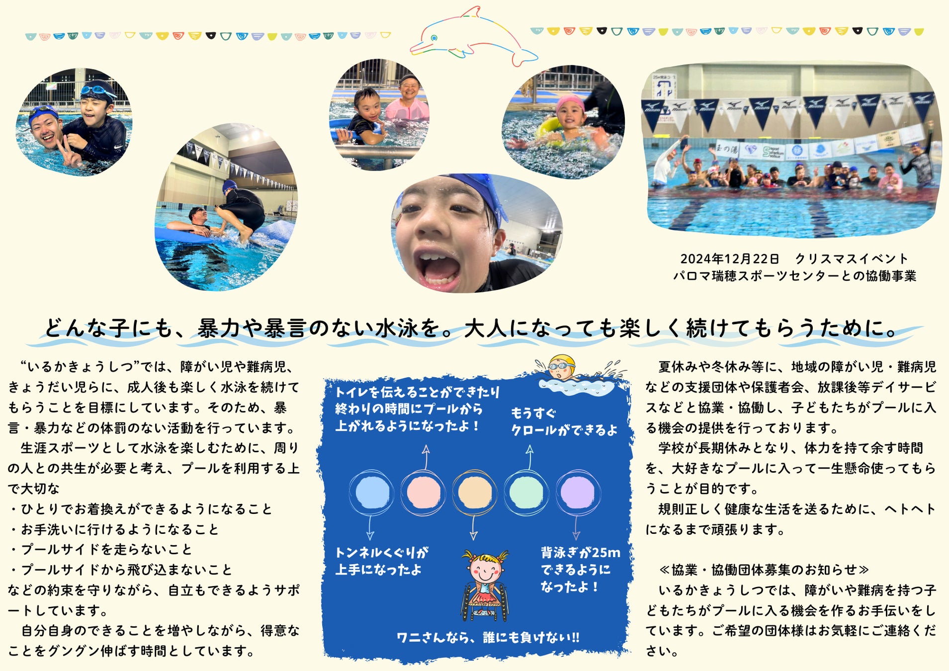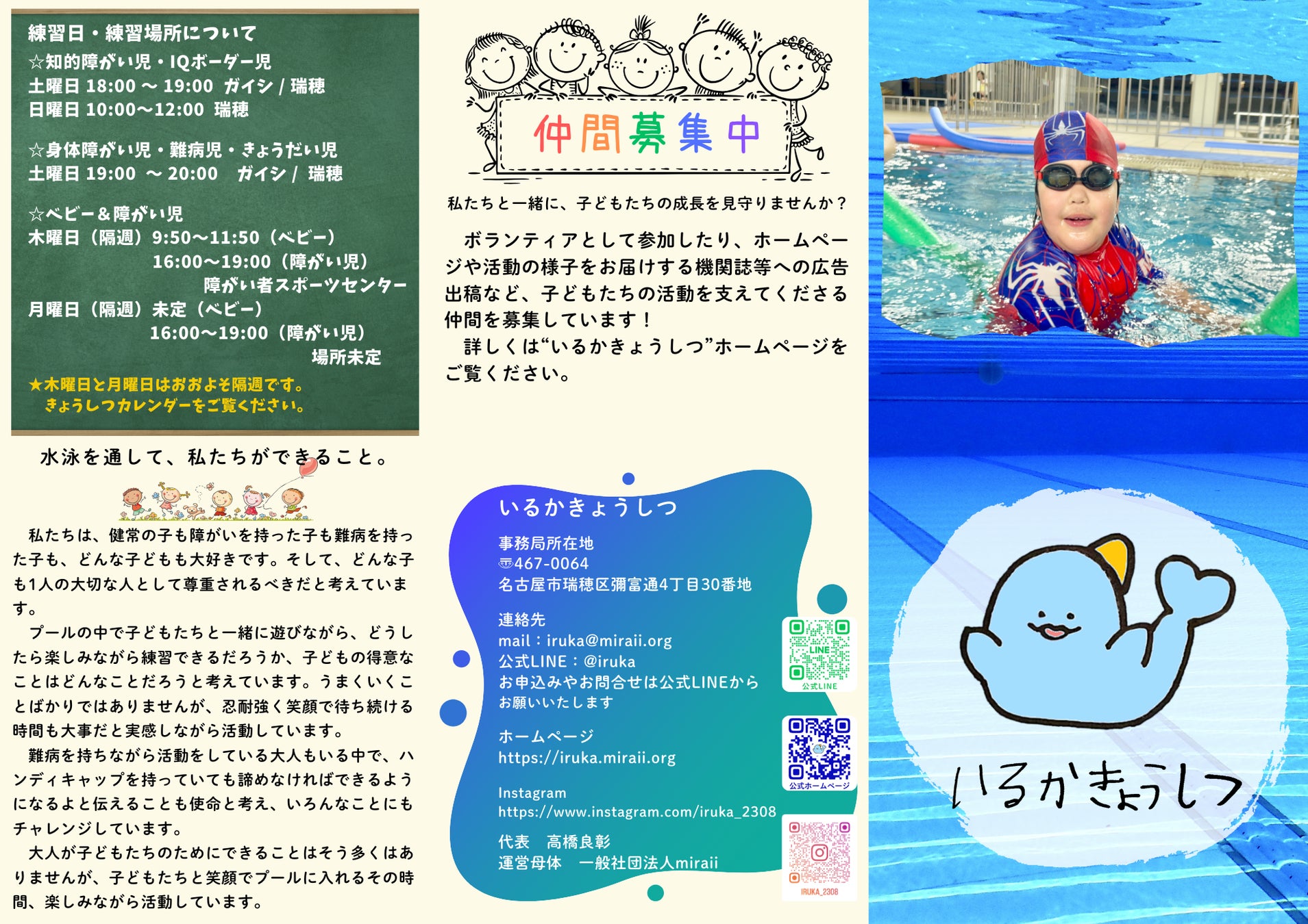 その取り組みのひとつとして、現在、任意団体として活動をしているハンディキャップ児のための水泳教室である“いるかきょうしつ”を法人に迎え入れ、miraiiの一事業として障がいや難病、きょうだい児に分け隔てのない水泳経験の支援を行っていくこととなった。