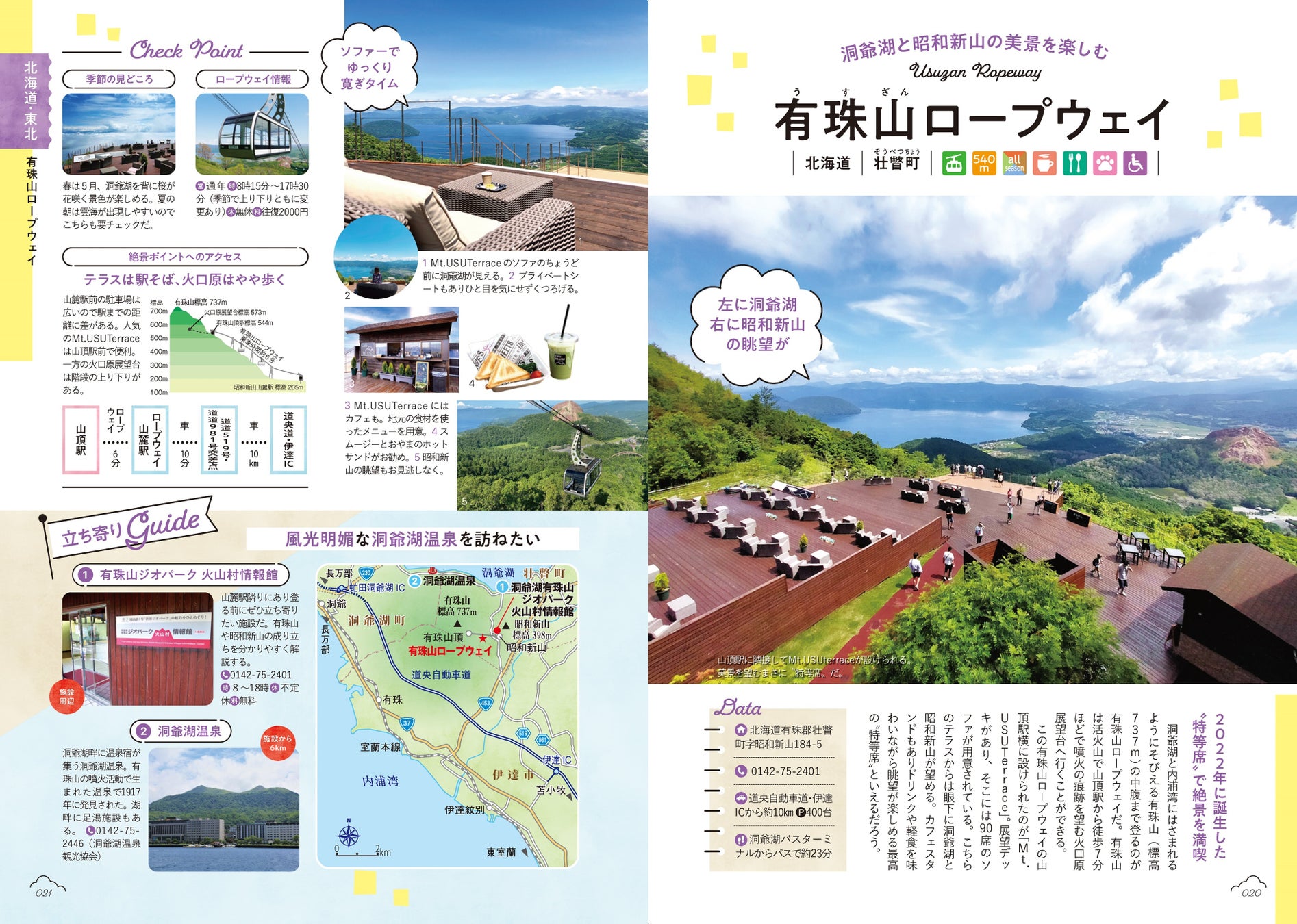 各施設については、山麓駅や山頂の標高、季節の見どころなどを紹介するほか、読めばきっと訪れたくなるオールカラーの美しい写真とともに掲載しています。さらに、主要インターからのアクセスマップや、帰りに立ち寄れる施設周辺の観光情報も掲載。この1冊で1日中楽しめる充実度の高いガイドブックになっています。北海道から九州まで、全国の天空テラス&展望台をピックアップしているので、どの地域にお住まいの方でもお楽しみいただけます。