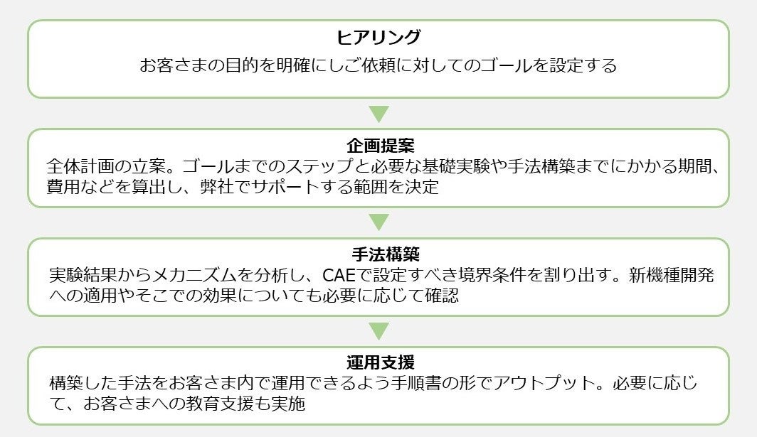 新規製品開発に向けた構造解析など、CAE解析の手法構築を行います。お客さまの実現したいことからゴールを明確にし、それに向けた計画の立案から、解析手法構築後の運用支援まで対応します。解析手法構築においては、基礎実験が必要になる場合もあります。これらについても当社でプランニングや実験を実施することで、お客さまの製品開発をワンストップでご支援します。