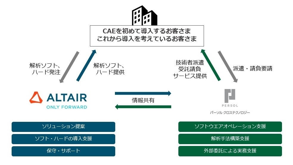 これからCAE解析の導入を検討中のお客さまには、アルテアから製品開発に最適なソリューション提案や技術サポートを行います。パーソルクロステクノロジーは、ツールを導入後の製品開発など、実務面の課題をサポートします。
