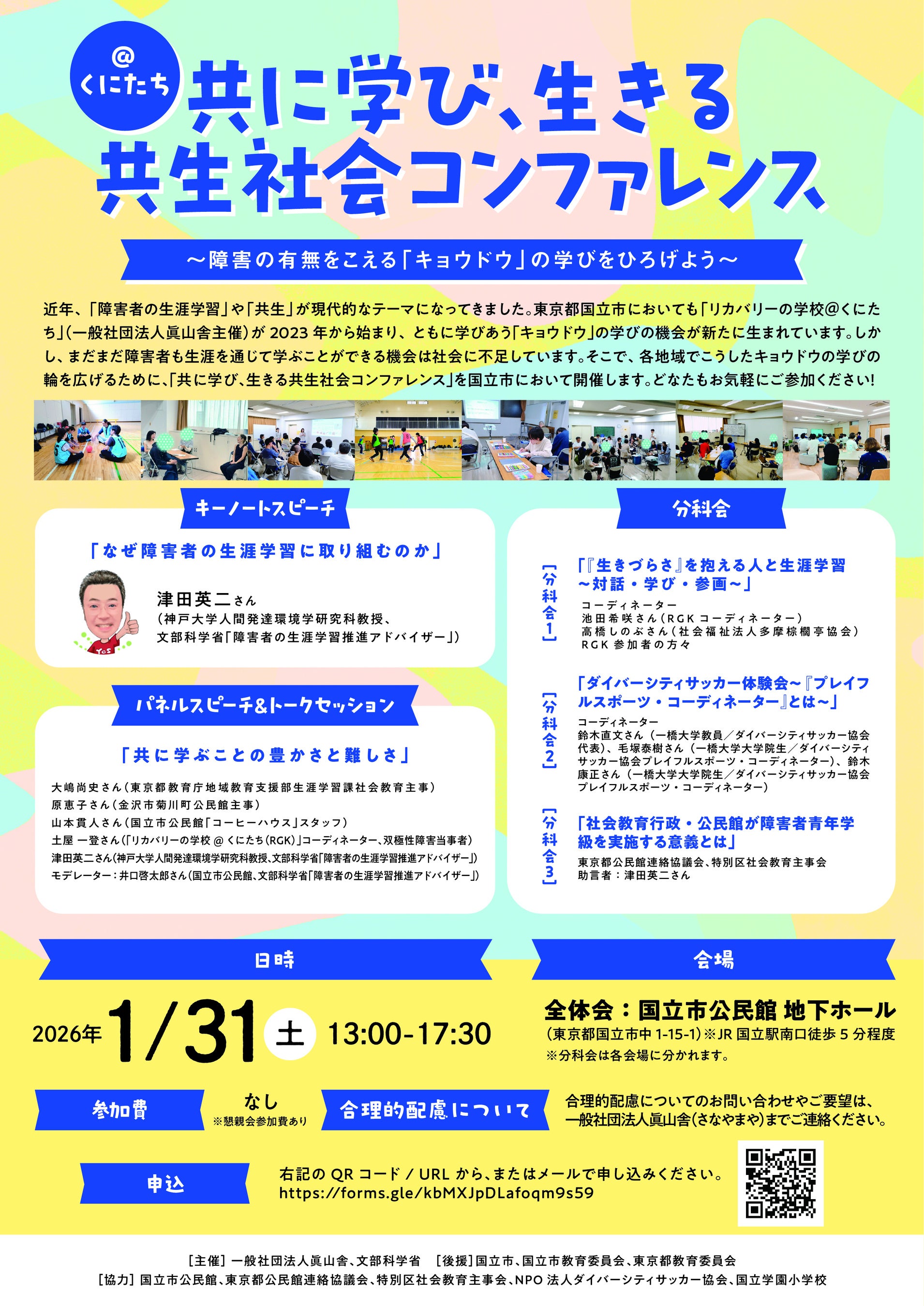 一般社団法人眞山舎(所在地:東京都国立市、代表理事:土屋 一登) は、東京都国立市で文部科学省「学校卒業後における障害者の学びの支援に関する実践研究」事業の委託を受け、国立市公民館と連携し、また、多くの関係者の協力を得て「リカバリーの学校@くにたち(RGK)」を実施しています。この度、「障害者の生涯学習」に取り組む、行政・民間の社会教育・生涯学習関係者を対象に、社会教育実践や学びの事例も含めた「共に学び、生きる共生社会コンファレンス@くにたち ~障害の有無をこえる『キョウドウ』の学びをひろげよう~」を2026年1月31日(土)に対面で東京都国立市で開催します。