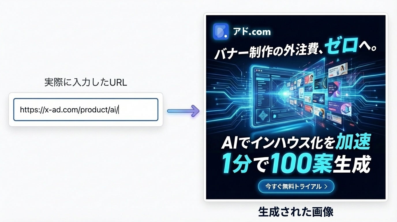 商品やサービスのURLを入力するだけで、”勝てる”バナー広告が瞬時に自動生成されます。