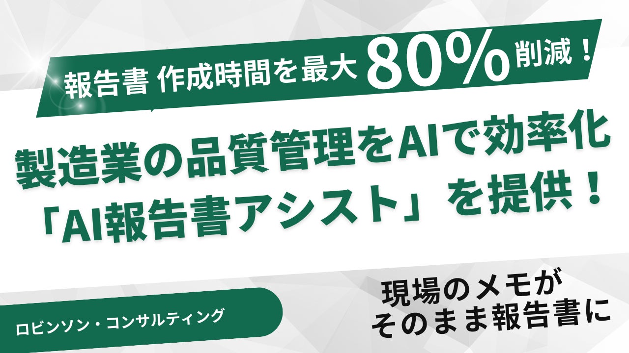 株式会社ロビンソン・コンサルティング(本社:東京都文京区、代表取締役:ロビンソン・コスモ)は、製造業の品質保証部門向けに、AIを活用したクレーム報告書作成支援「AI報告書アシスト」の提供を開始しました。