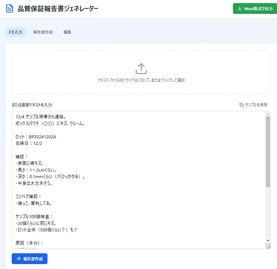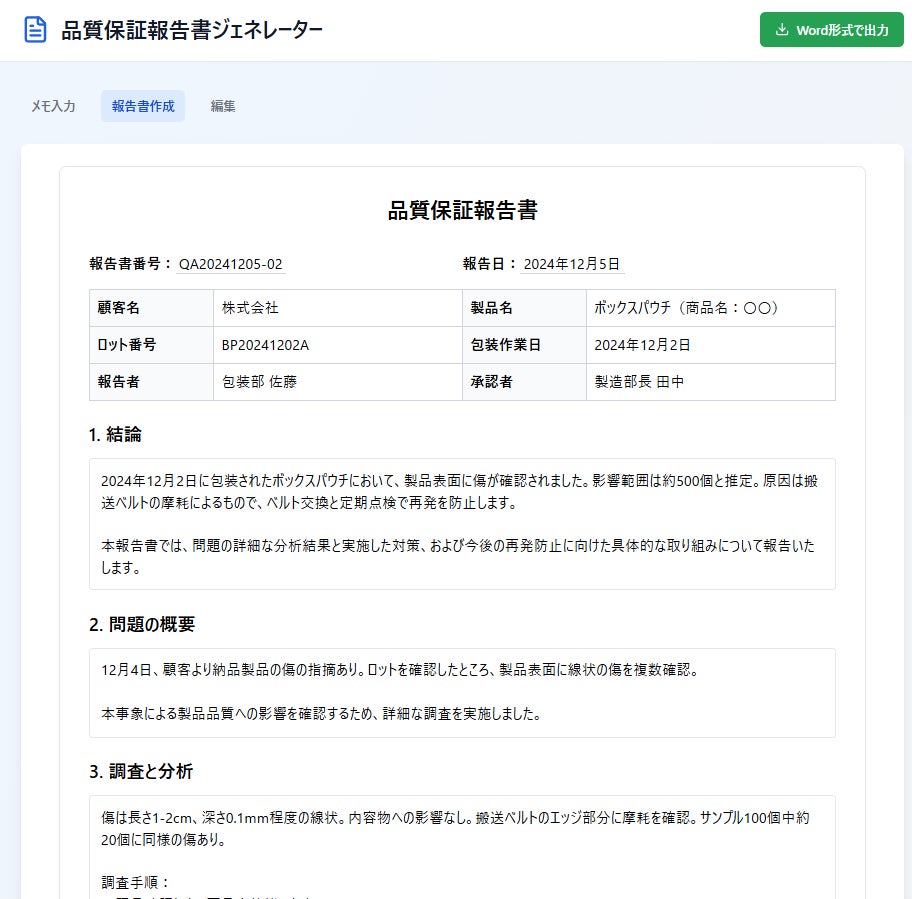 生成された報告書は、Word形式で出力。社内共有や、上長への提出もスムーズです。