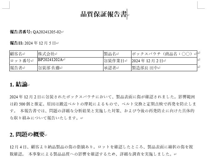 新人でも、ベテランと同じレベルの報告書を作成でき、品質管理部門全体のレベルアップに貢献します。