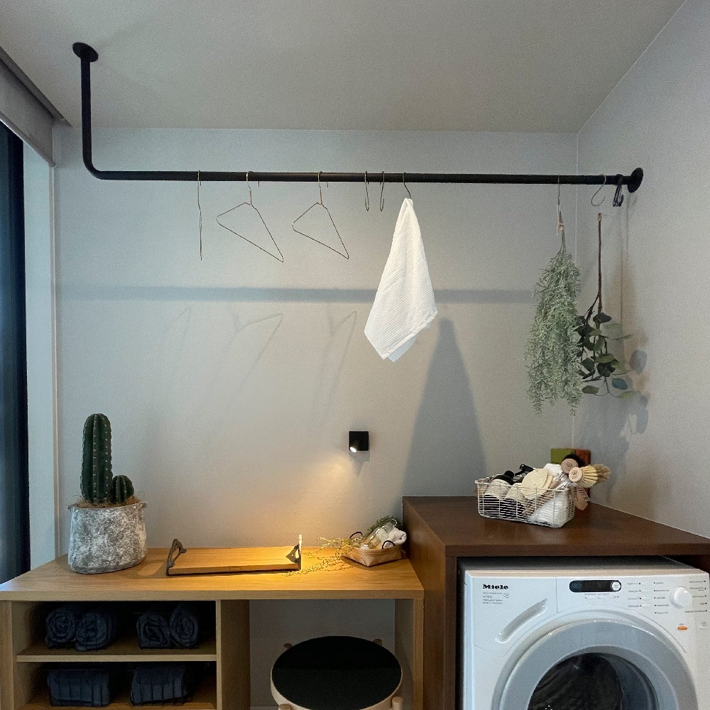 内装をおしゃれに彩るシンプルな物干し『Hosuba』。曲げ、溶接で一体化され、ノイズのない美しいデザインであることはもちろん、耐荷重30kgという安心感のある高強度を実現。お得な価格で購入できる標準サイズの他、1㎜単位でのオーダーも可能。使わないときは植栽を吊るすだけでも、素敵な空間演出が可能です。