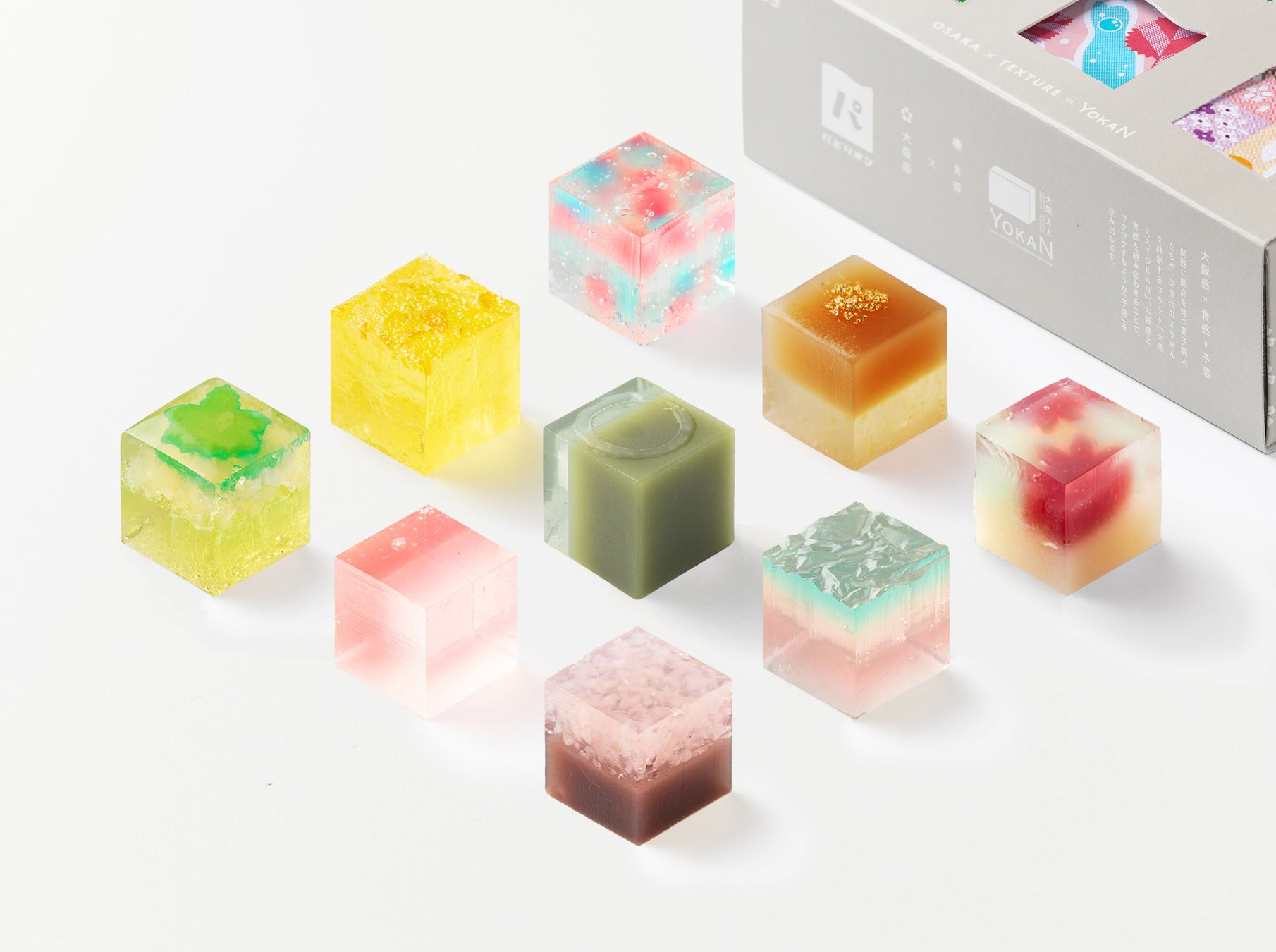 「パビリオン」は『大阪ええYOKAN』の第1弾シリーズとして2023年5月にデビューしました。大阪らしい遊び心と見た目のバリエーション、そして確かな味と食感をキューブの中にギュッと閉じ込めた、斬新な創作ようかんです。