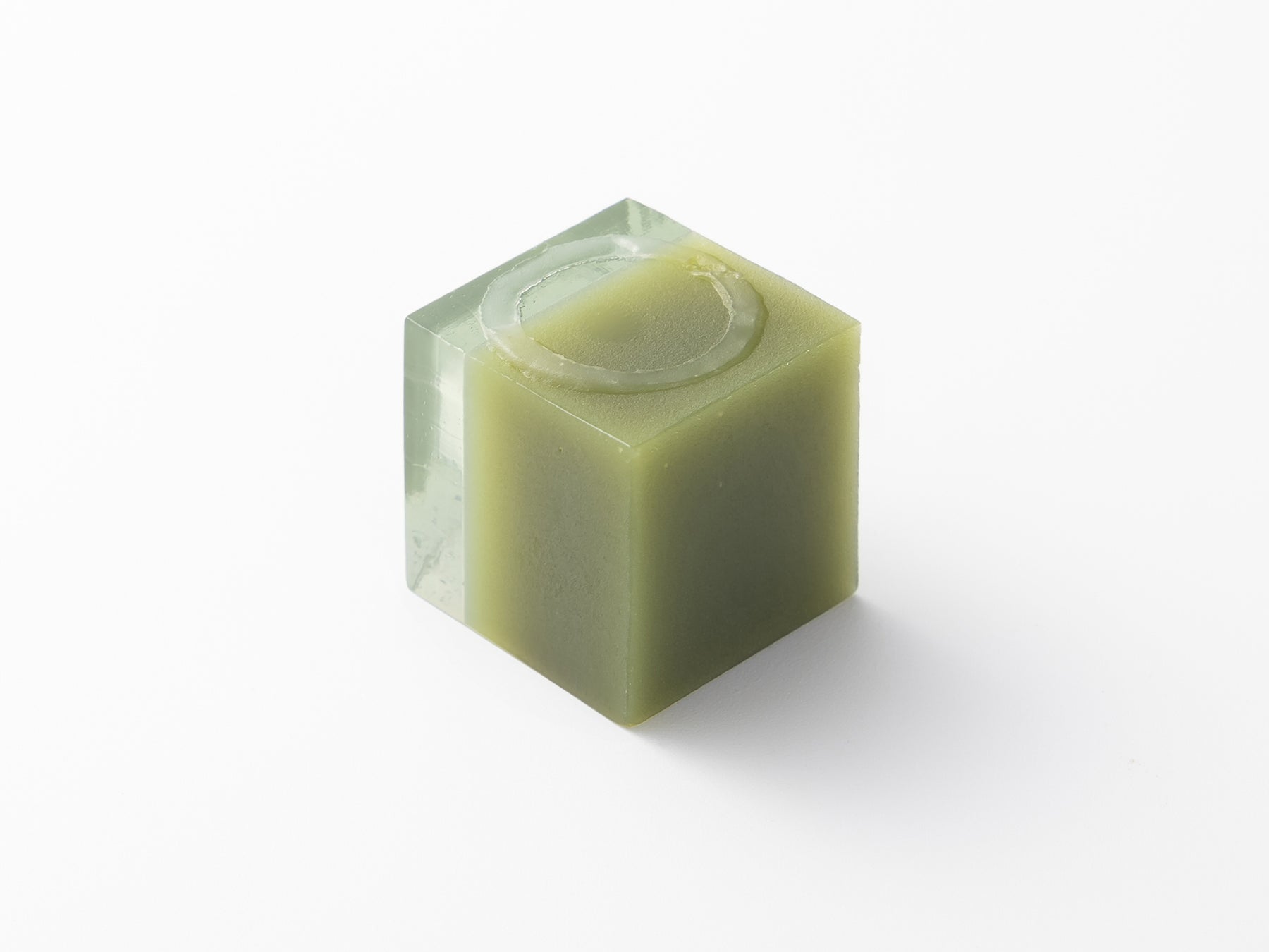 2025 大阪・関西万博の会場となる夢洲をモチーフにしたようかんで、西山美里さん(環境都市工学部 3年生)のアイデアです。陸と海、そして会場のリング(大屋根)をキューブの中に表現しています。陸の部分は抹茶ようかん、海はうっすら水色に染めた錦玉かん(寒天ゼリー)で、リングは"刷り込み"と呼ばれる技術を使い、舞洲の会場を表現しました。
