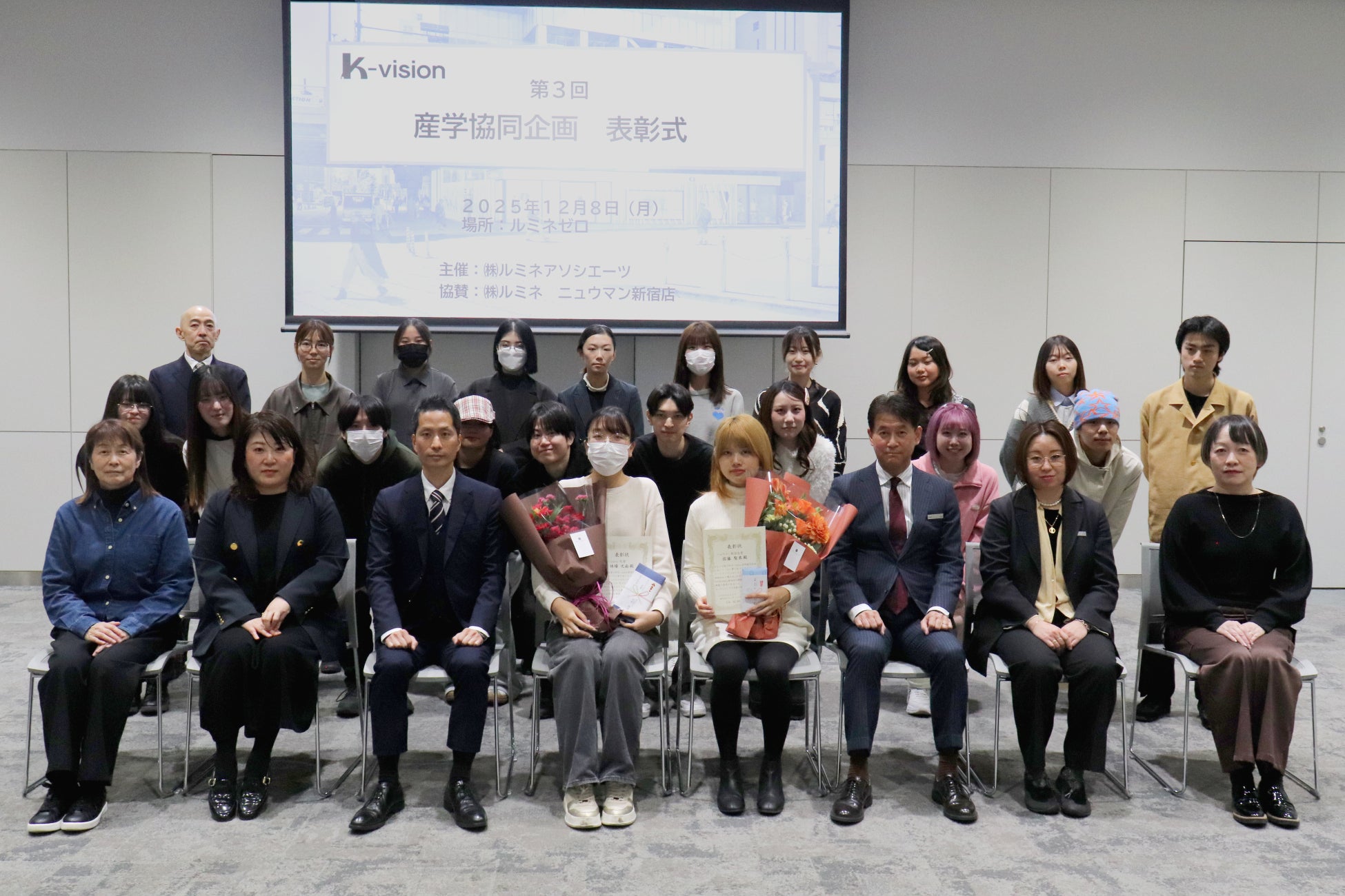 株式会社ルミネアソシエーツ(本社:東京都新宿区、代表取締役社長:文野 誠司)の取扱広告媒体である屋外向デジタルサイネージ「K-vision」の放映枠を、学校法人原宿学園・東京デザイン専門学校(東京都渋谷区、学校長:小林登志子)との産学協同企画として、同校ビジュアルデザイン科3年生の生徒に提供。12月8日(月)に審査を経て選ばれた受賞作の発表と表彰をルミネゼロ(東京都渋谷区、NEWoMan新宿5F)にて行いました。受賞作は1年間を目途にK-visionにて放映されます。