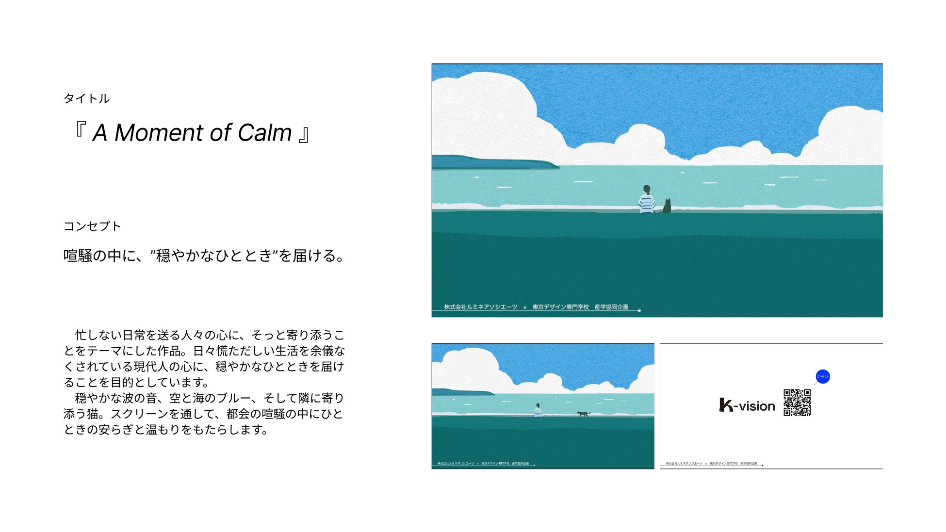 最初に映像の美しさが印象に残りました。それに加えて「人に寄り添う」という抽象的で難しいテーマをよくご自身なりに解釈されて、うまく表現されたなと思います。これからK-visonでこの映像が流れることを想像すると、忙しい街中の目線の高さでこういった穏やかな映像が流れることで、一時の安らぎを提供することになるのではと選定しました。
