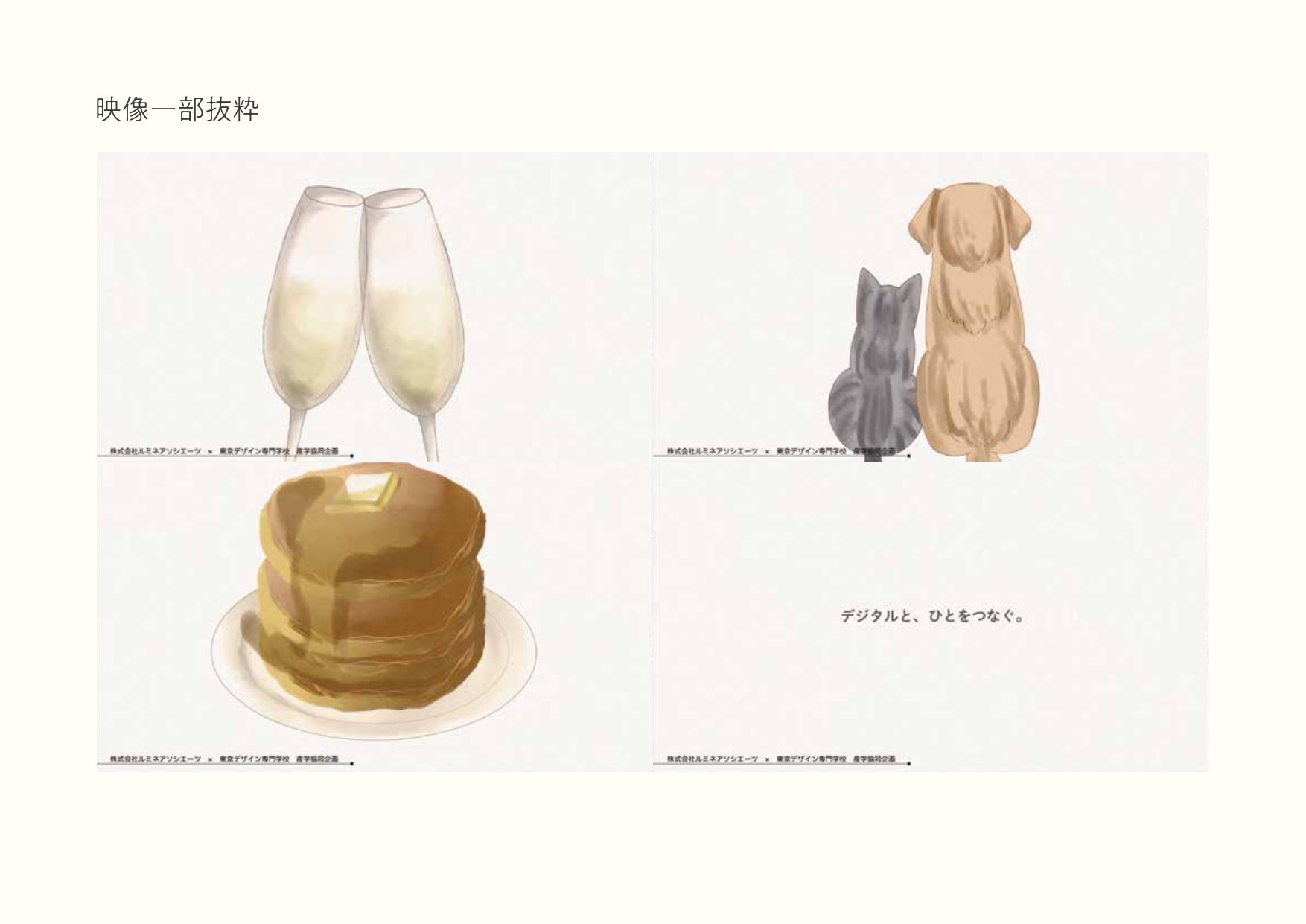 大賞をいただいてすごくびっくりしています。私の映像で少しでも見る方の心や気持ちが安らいでくれればいいなと思います。「デジタルと、人をつなぐ」というコンセプトで作りました。人に寄り添うスクリーンというテーマを、シャンパングラスの乾杯で人と人がつながる表現をしたり、動物など自分の好きなことで少しでも気持ちがあたたかくなることを思って制作しました。