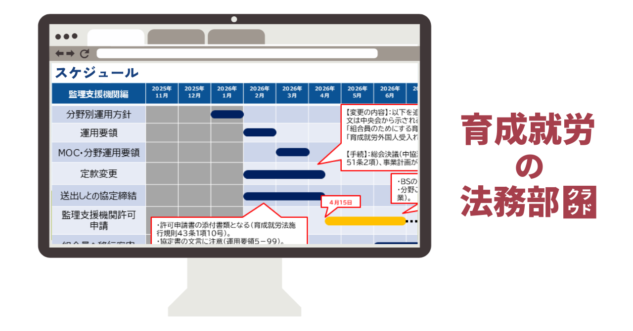 現在の監理団体をはじめとした関係企業においては、組織全体の体制変更が求められる極めて重要な局面です。しかしながら、従業員一人ひとりの制度認識をアップデートし、実務に適用させるには、膨大な時間と労力を要することが予想されます。