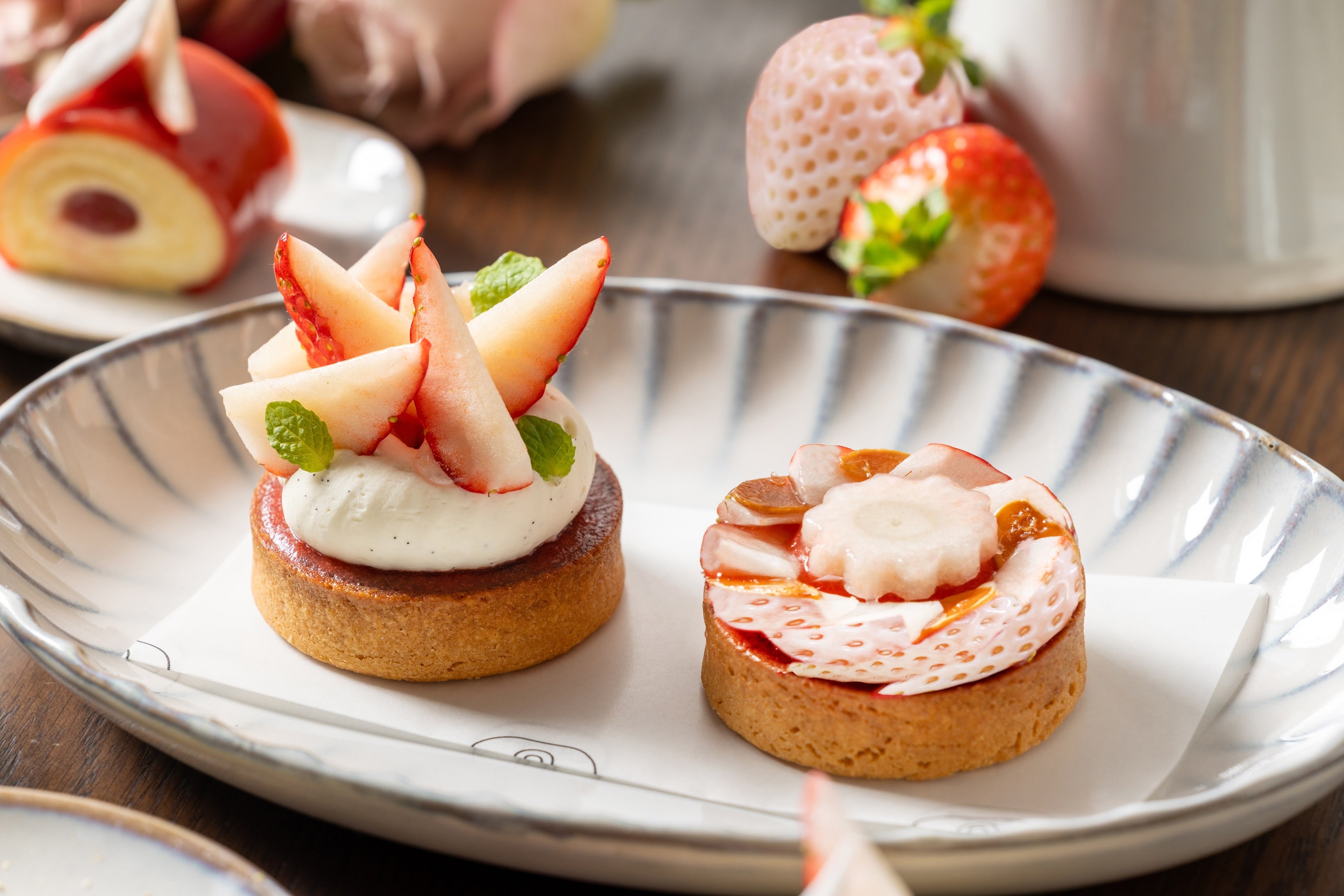 メインスイーツの「季節のクロスタータ」には、濃厚な味わいの“あまおう”と、淡い紅色が美しい白いちご“初恋の香り”の2種をご用意。 あまおうのタルトは、ホワイトチョコレートガナッシュとマダガスカル産バニラの穏やかな甘みに、爽やかなミントのアクセントを添え、いちごの果実味を引き立てた一品。白いちごのタルトは、アーモンドとアマレットのクリームに芳醇な香りの“初恋の香り”をあしらい、北イタリアの菓子文化を思わせる、懐かしいなかにもシェフのこだわりを感じる洗練された味わいに仕上げました。「季節のパスティッチーニ」では、九州産いちごとココナッツクリームのスイスロールなど、いちごの個性を多彩に表現した3種のスイーツをご用意。セイボリーには、カフェの人気メニュー「セルジオのフライドムール貝」をはじめ、アンチョビとヘーゼルナッツに柚子胡椒のアクセントを効かせた「ウオーヴォ・ピエモンテーゼ」など、シェフ渾身の3品が並びます。