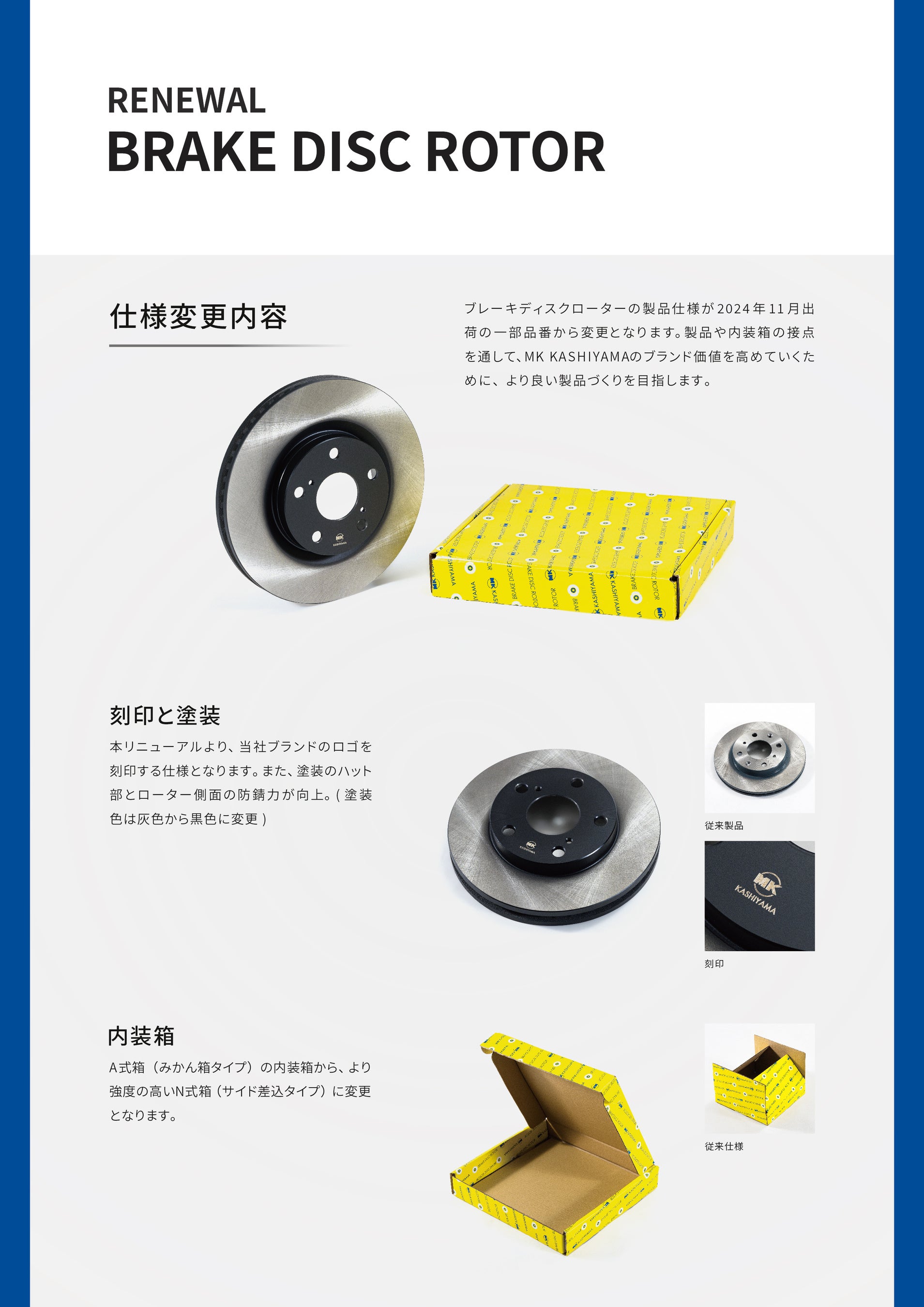 ブレーキディスクローターの製品仕様が2024年11月出荷の一部品番から変更となります。製品や内装箱を通したタッチポイントにおいて、MK KASHIYAMAのブランド価値を高めていくためのより良い製品づくりを目指します。
