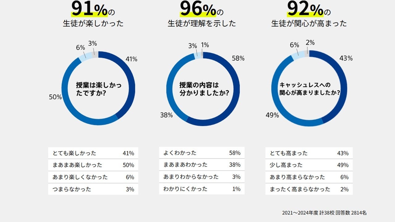 これまでの4年間で、累計38校 約3700名の生徒がプログラムを受講しました。授業では、2021年度から全面実施された中学校新学習指導要領(技術・家庭科)に基づいたオリジナル教材を用います。キャッシュレスが推進されている背景や普及することで、社会や私たちの生活がどのように変化するかを学びます。
