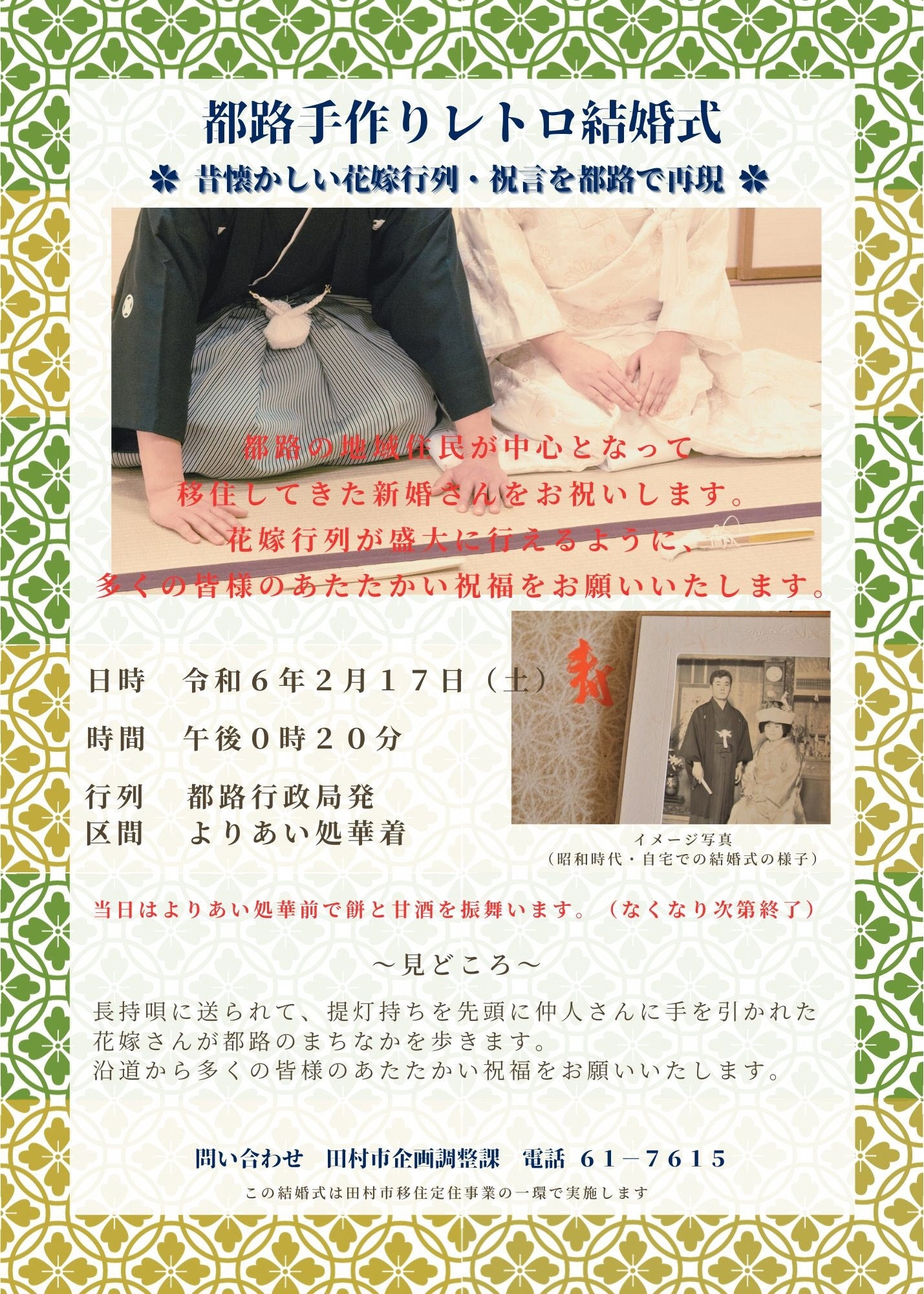 2024年2月17日(土)福島県田村市都路町で、県外から田村市へ移住し生活を送るご夫婦を昔懐かし花嫁行列や祝言を地域住民が中心となって再現する「手作りレトロ結婚式」でお祝いします。