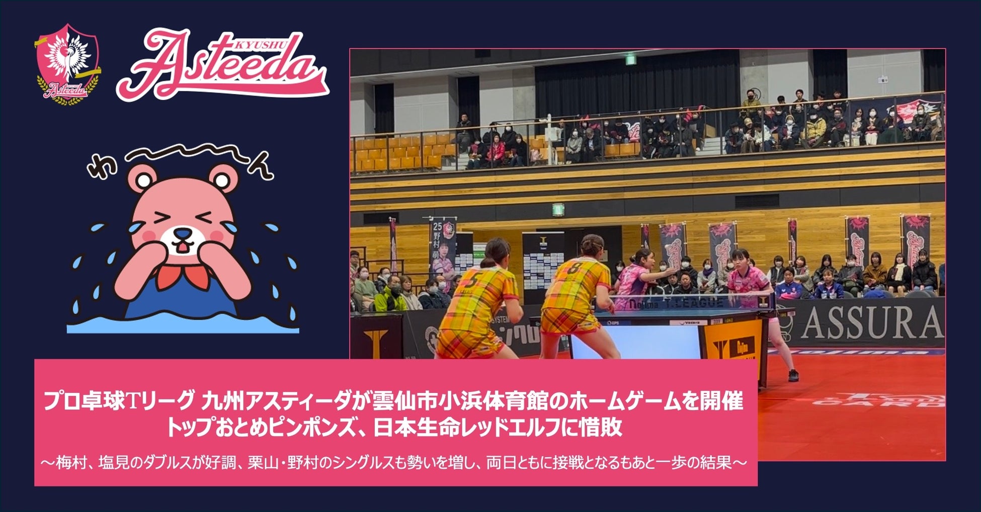 Tリーグ所属プロ卓球チーム「九州アスティーダ」を運営する「九州アスティーダ株式会社」(所在地:福岡県大野城市、代表取締役 川面 創 以下、当チームおよび、当社)は、2025年1月11日および1月12日に雲仙市小浜体育館にて開催されたホームマッチにて、トップおとめピンポンズ名古屋、日本生命レッドエルフに それぞれ 1 – 3 にて敗北したことをお知らせします。