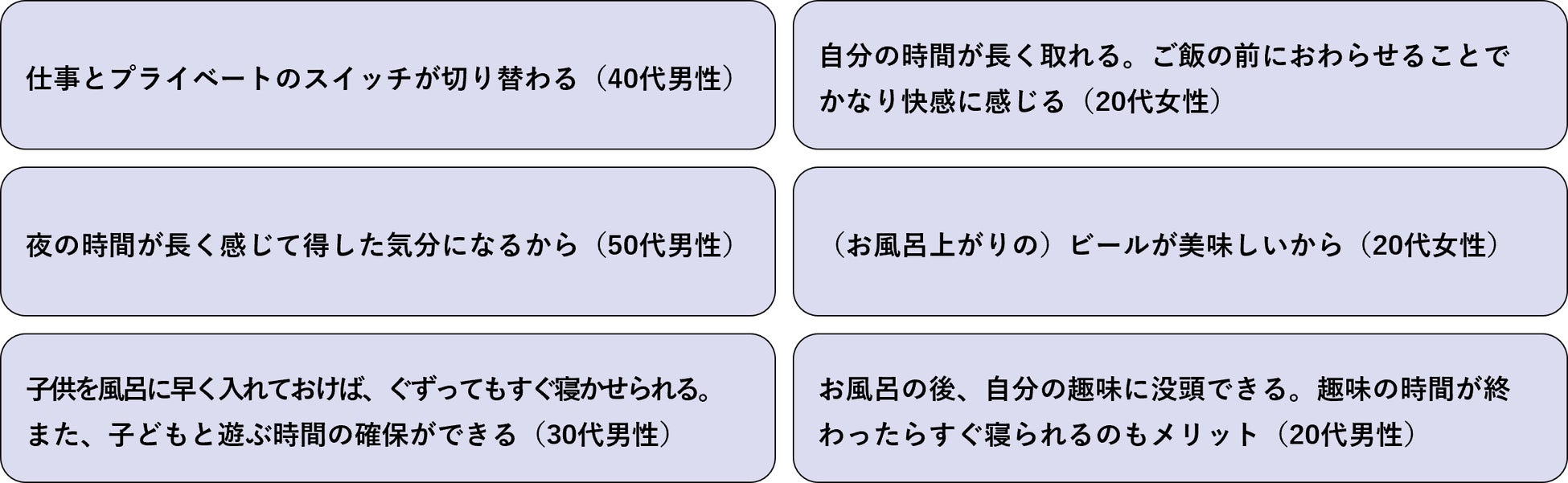 帰宅後すぐの入浴により、『自分の趣味や家族との時間を有意義に過ごせる』や『夜時間が長く得した気分になる』など“充実した夜時間”を実感している声が多数。