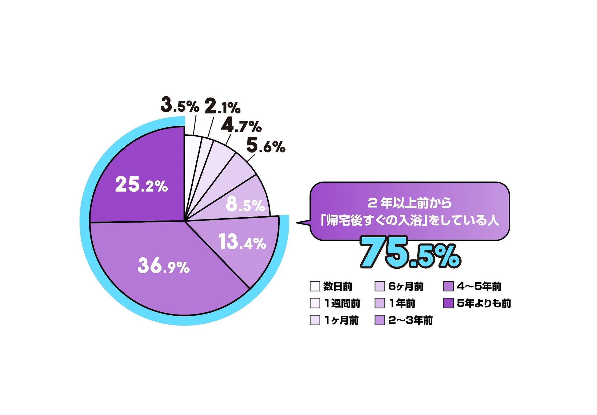 帰宅後すぐの入浴を「毎日している人」と「できる日にしている人」に対して、いつから生活に取り入れているかを調査しました。すると、帰宅後すぐの入浴をしている人の約8割(75.5%)が2年以上も前から帰宅後すぐの入浴を生活に取り入れていることがわかりました。生活習慣として帰宅後すぐの入浴をすることが定着していると考えられます。
