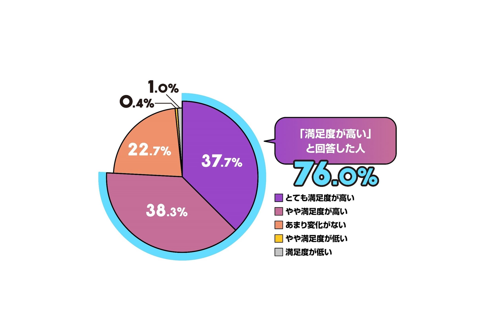 しかし、帰宅後すぐの入浴を「毎日している人」と「できる日にしている人」に対して、帰宅後すぐの入浴をした日と、それ以外の日で夜の時間の過ごし方の満足度がどれぐらい変わるのかを調査したところ、帰宅後すぐの入浴をした日の方が満足度が高いと回答した割合が約8割(76.0%)を占める結果となりました。したがって、現状は生活に取り入れていない人も、入浴のタイミングを“帰宅後すぐ”にすることで、夜の過ごし方の満足度を高めることができるといえます。