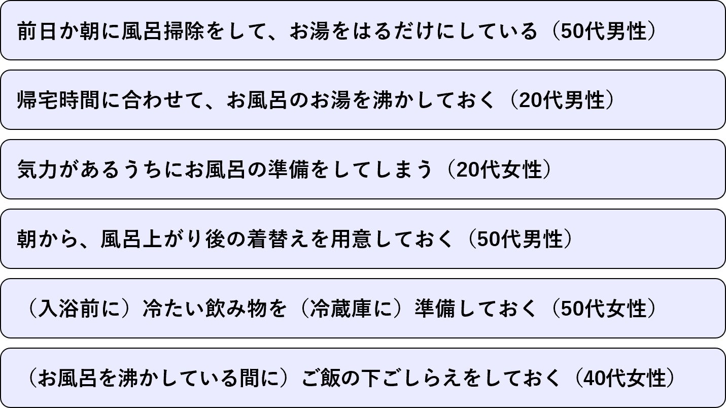 また、帰宅後すぐの入浴をするための工夫として『朝に寝巻も用意しておく』や『お風呂掃除をすませておく』といった“ 入浴前の準備のためのハードルを下げる” 回答が目立ちました。これらの工夫は、着替えの用意といったように手軽に始められるものが多く、継続することが困難ではない回答が多かったです。他にも、『冷たい飲み物を冷やしておく』などの、“お風呂後の楽しみを作る” 工夫も行っていました。